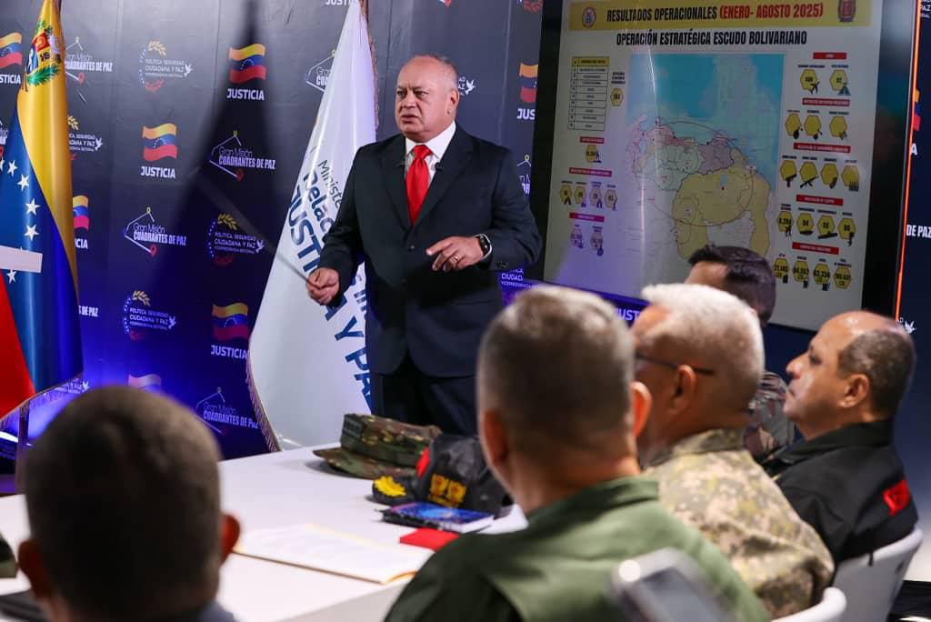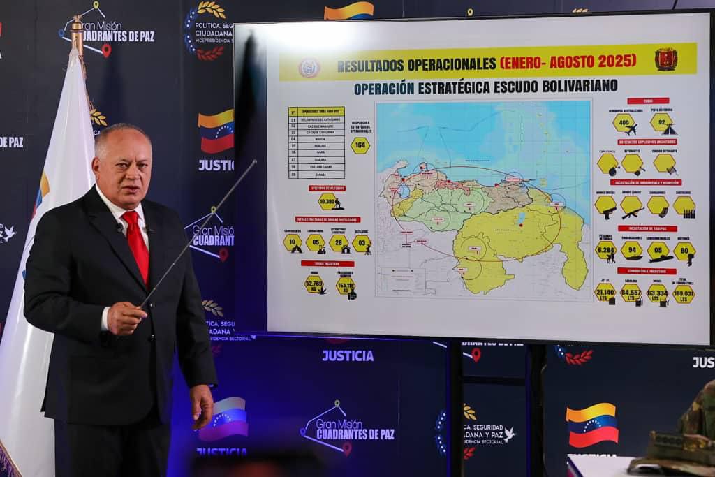 Cabello presentó varias cifras sobre el avance de las operaciones realizadas en el decomiso de drogas y la destrucción de campamentos ilegales utilizados por organizaciones delictivas. “Nosotros este año nada más, según estos números (del informe), 106 toneladas representan el 5 por ciento. Sin finalizar el mes de agosto ya llevamos 52.769 kilos de droga, es decir, 52,7 toneladas de droga incautadas, casi la mitad de lo que en teoría debería salir por aquí, según los números de la ONU”, aseveró.