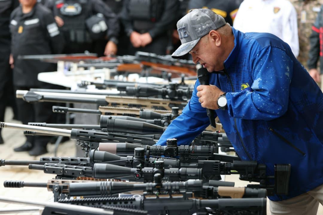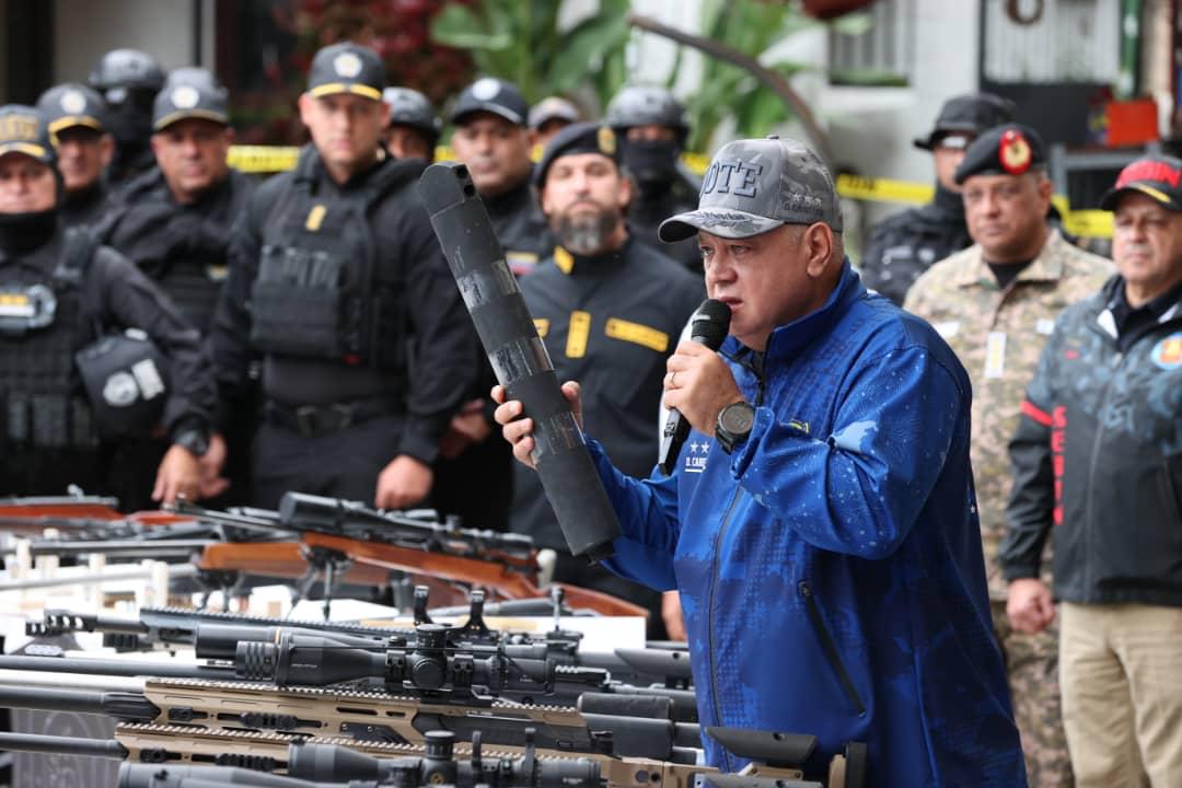 Entre las armas de guerra incautadas por los organismos de seguridad están un fusil .50 (punto 50), una arma totalmente “mortífera y letal” que son utilizados para tumbar helicópteros, explicó Cabello, quien describió que dicho armamento tiene agregado, una mira telescópica y un silenciador. “Los expertos en armas dicen que no habían visto esto nunca. Disparan con esta arma, apunta con esta mira y nadie escucha”, puntualizó.
