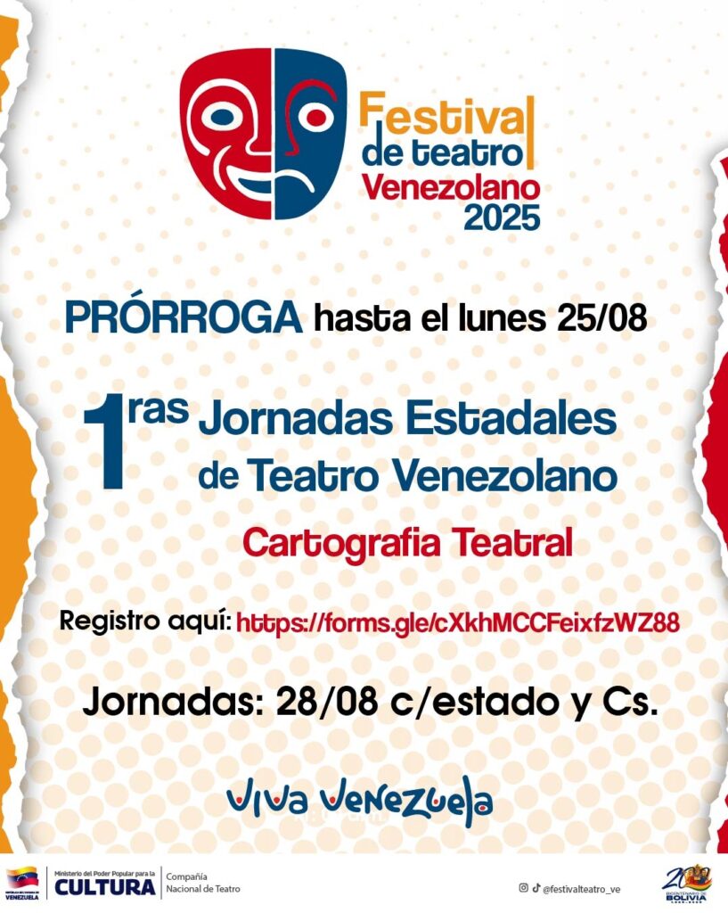El Festival de Teatro Venezolano 2025 anunció la prórroga del registro para las “1ras Jornadas Estadales de Teatro Venezolano: Cartografía Teatral”, hasta este lunes 25 de agosto. Esta iniciativa reunirá a creadores y creadores de las artes escénicas en todos los estados del país para trazar un mapa de la realidad artística y productiva del sector.
