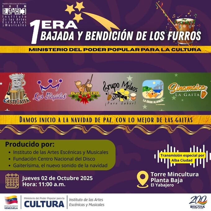 El Instituto de las Artes Escénicas y Musicales (IAEM), ente adscrito al Ministerio del Poder Popular para la Cultura, celebrará el inicio de la Navidad 2025 con la primera Bajada y Bendición de los Furros. Esta tradición, que marca el comienzo de la temporada de la gaita en Venezuela, se llevará a cabo el jueves 2 de octubre a partir de las 11:00 a. m. en la planta baja de la Torre Norte del Centro Simón Bolívar (“Torres de El Silencio”), sede del Ministerio para la Cultura, en el espacio conocido como “El Yabajero”.