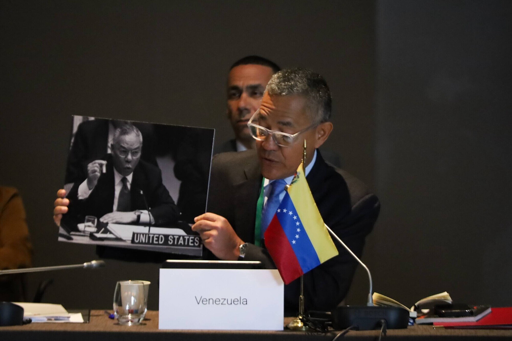 Esto tiene precedentes preocupantes. Me permito recordarles el caso de Irak. Aquí traigo una fotografía que ustedes recordarán: es el señor Colin Powell, quien ante el Consejo de Seguridad de las Naciones Unidas mostró un supuesto frasco de ántrax, como prueba irrefutable de que había armas de destrucción masiva en Irak. Un millón de muertos después, este mismo personaje reconoció que todo era mentira y se disculpó con un simple “lo siento”.