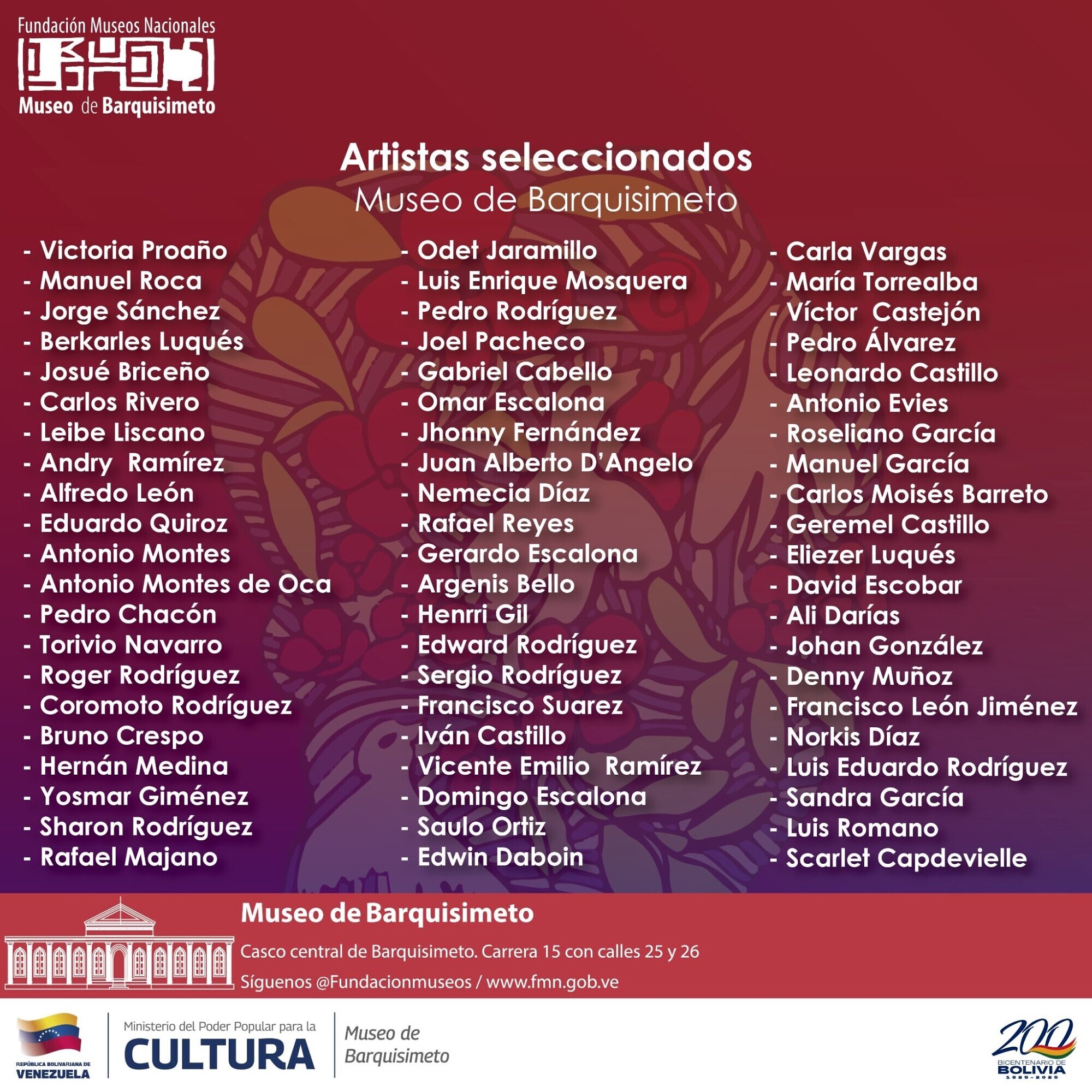 Las listas de los primeros seleccionados se distribuyen de la siguiente manera: en Carabobo, 54 artistas fueron seleccionados y sus obras se presentarán en el Museo de Arte de Valencia; en Lara, 63 artistas; en Mérida, 17 artistas en la Galería La Otra Banda y 14 en el Museo de Arte Moderno Juan Astorga Anta; y finalmente, 17 artistas de los estados Táchira, Portuguesa, Apure y Barinas.
