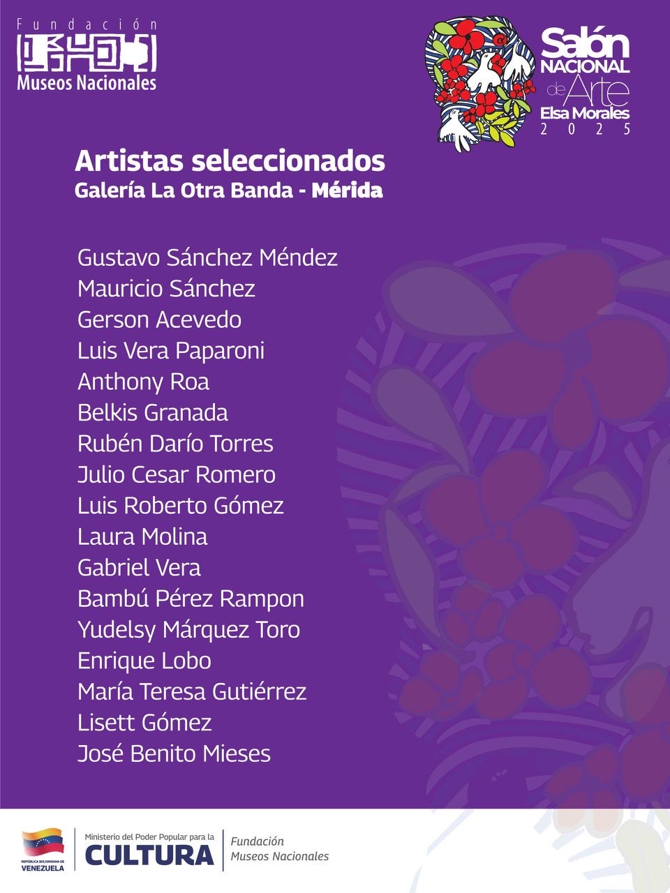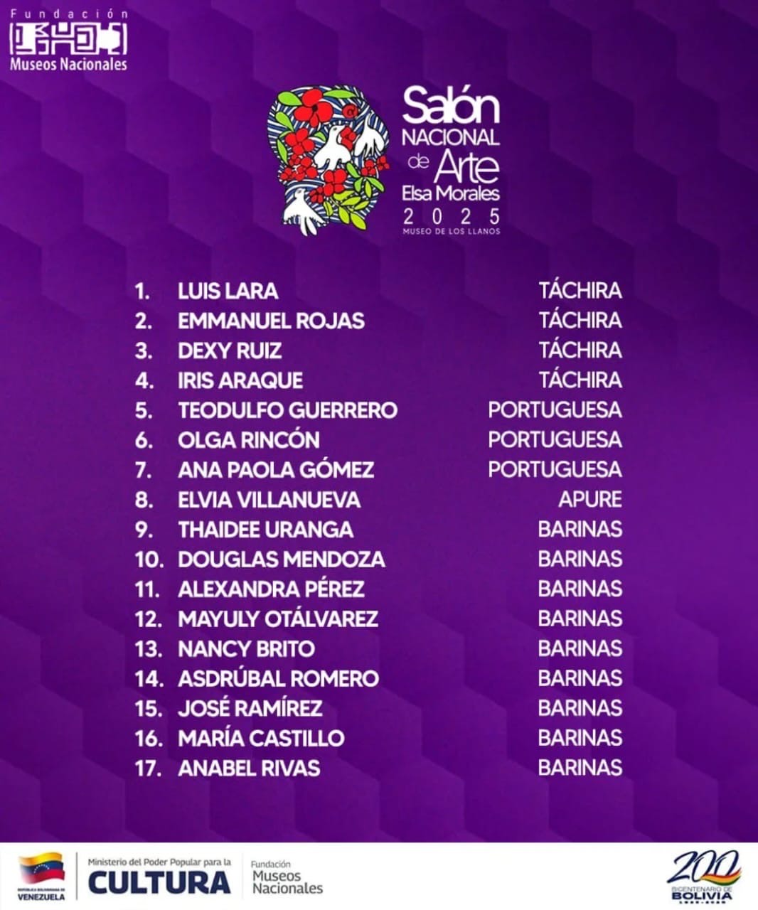 El Ministerio del Poder Popular para la Cultura (MPPC) anunció este sábado 20 de septiembre, el primer grupo de artistas plásticos seleccionados para participar en el Salón Nacional de Arte Elsa Morales 2025. Esta decisión se tomó luego de una exitosa convocatoria que cerró el pasado domingo 14 de septiembre.
