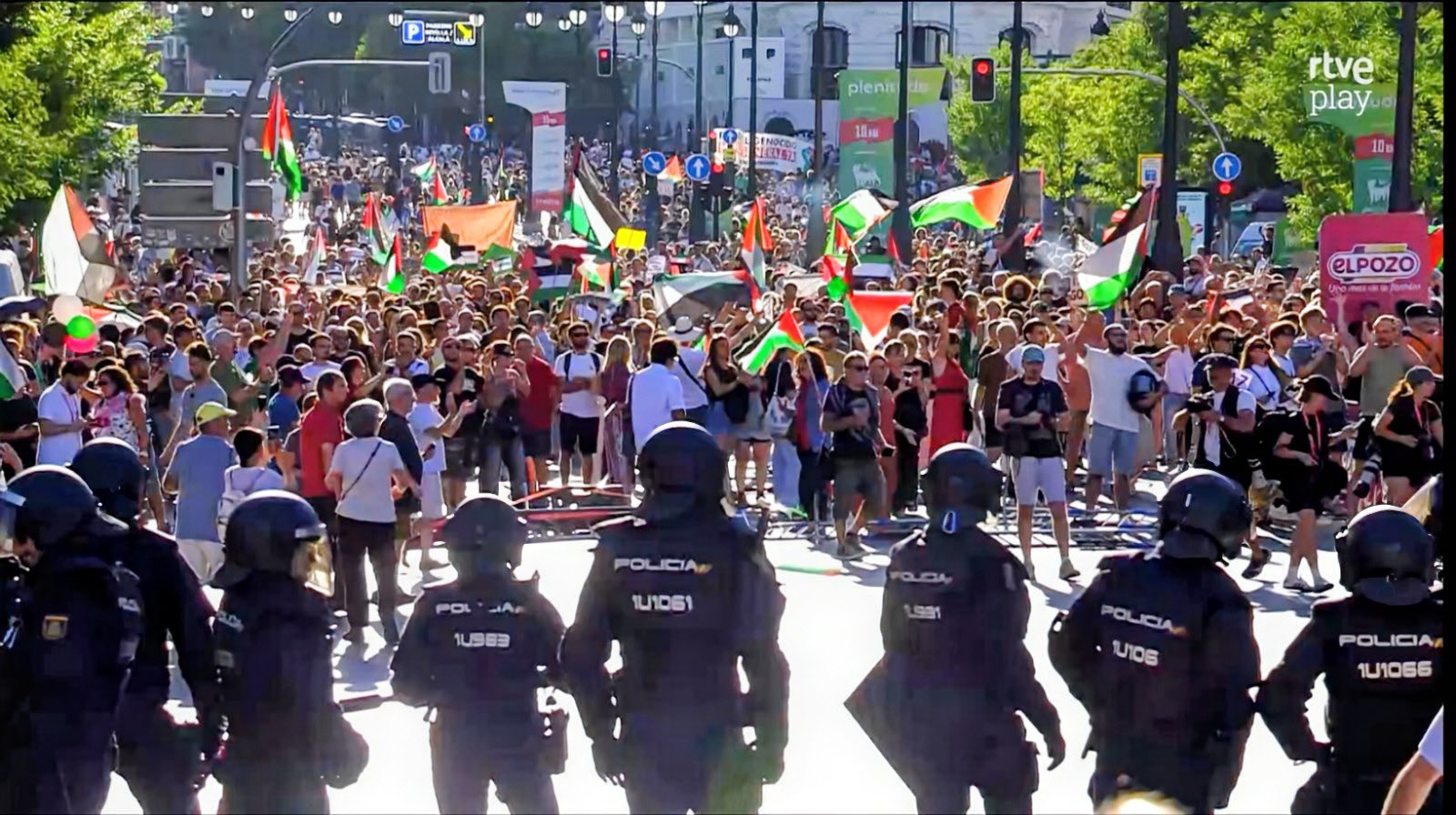 En Atocha, uno de los puntos calientes y de mayor concentración de banderas palestinas, la Policía Nacional desplegó dos tanquetas. Atocha fue uno de los puntos donde se tiraron las vallas y donde más fuerte ha cargado la Policía Nacional, que ha llegado a usar gas lacrimógeno y balas de goma. Los incidentes han obligado a parar la carrera antes de llegar al circuito.