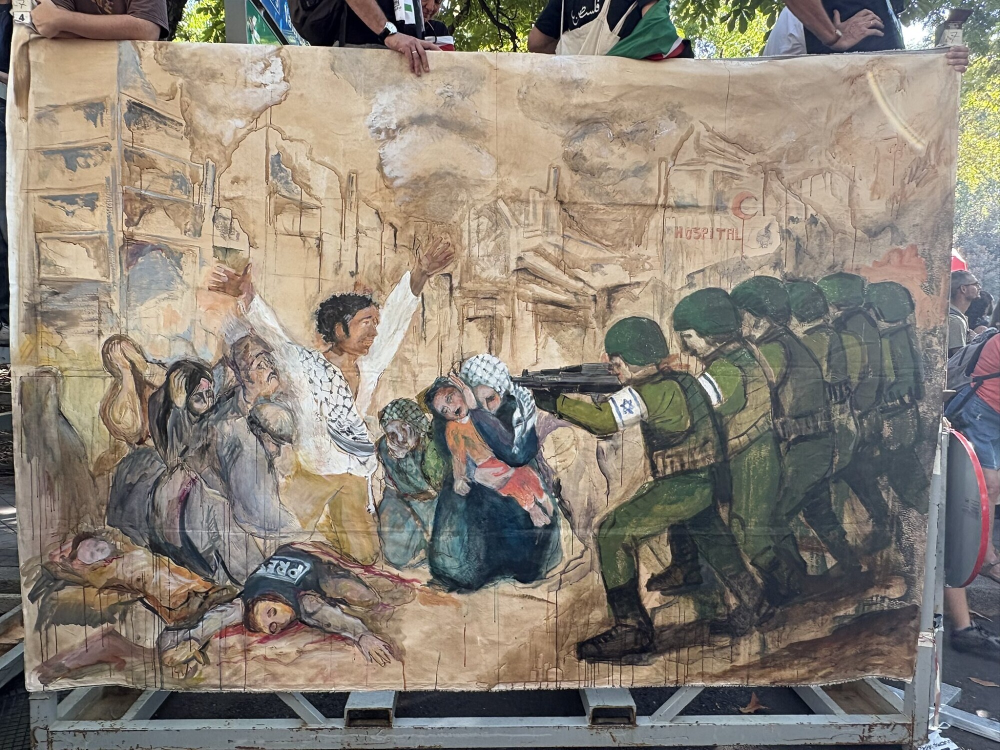 Dos estadounidenses han acudido con dos banderas de su país, una con el lema “Make América Gay Again” y la palabra fascismo tachada, y otra con el símbolo de la paz. Delante del Museo del Prado, otro grupo ha mostrado un mural del “Fusilamiento del tres de mayo” de Goya donde los asesinos son soldados israelíes y los fusilados palestinos.