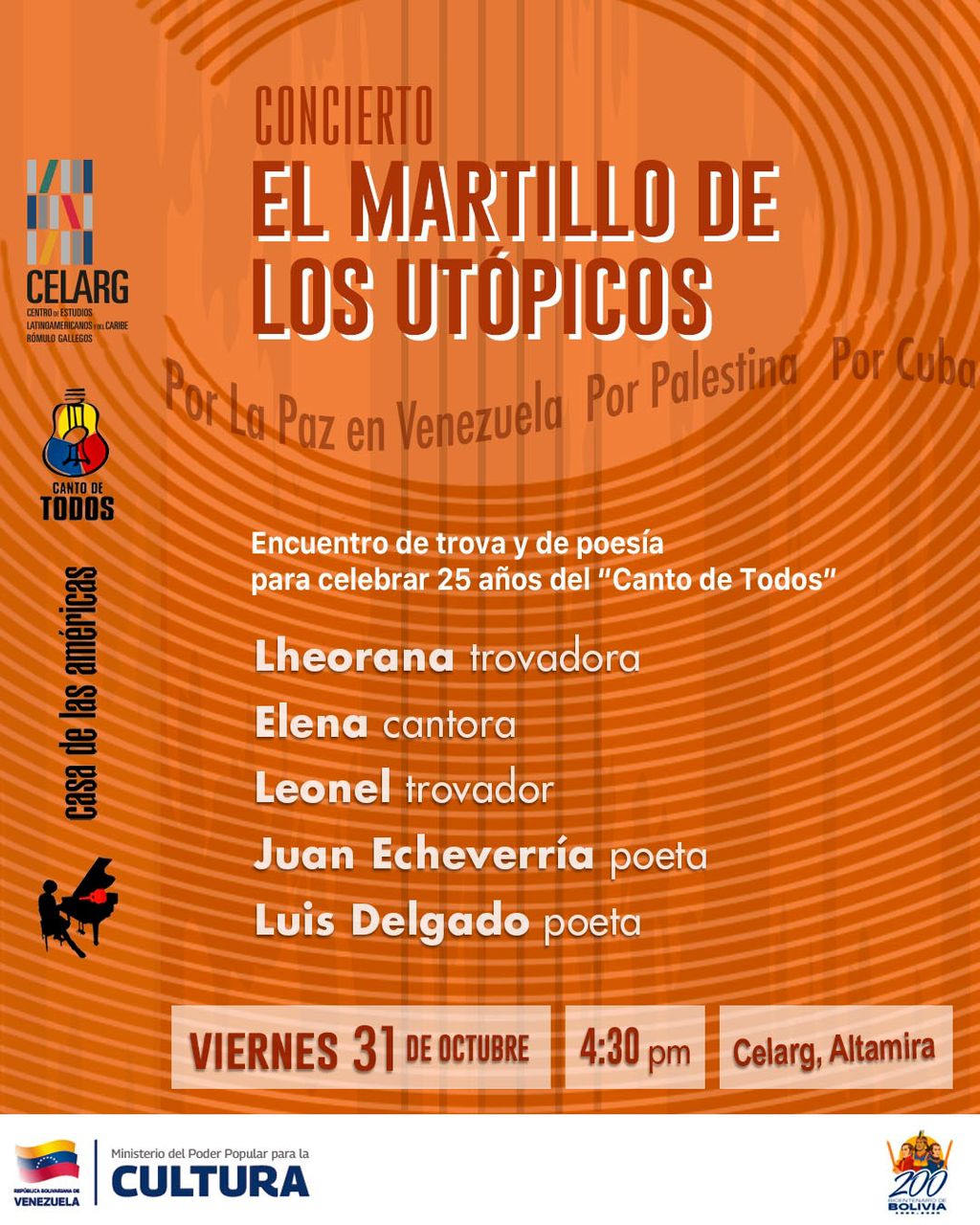 El concierto “El martillo de los utópicos”, se realizará este 31 de octubre de 2025 en el Centro de Estudios Latinoamericanos y del Caribe Rómulo Gallegos (Celarg) en Altamira, a las 4:30 p.m. Lo organiza dicha institución junto a la Casa de las Américas