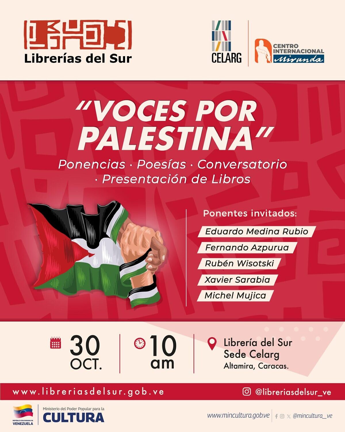 Las Librerías del Sur, el Centro Internacional Miranda y el Centro de Estudios Latinoamericanos y del Caribe Rómulo Gallegos realizarán este jueves a las 10 de la mañana la serie de ponencias, poesías, conversatorios y presentación de libros “Voces por Palestina”. Edaurdo Medina Rubio, Fernando Azpurua, Rubén Wisotski, Xavier Sarabia y Michel Mujica serán algunos de los ponentes.