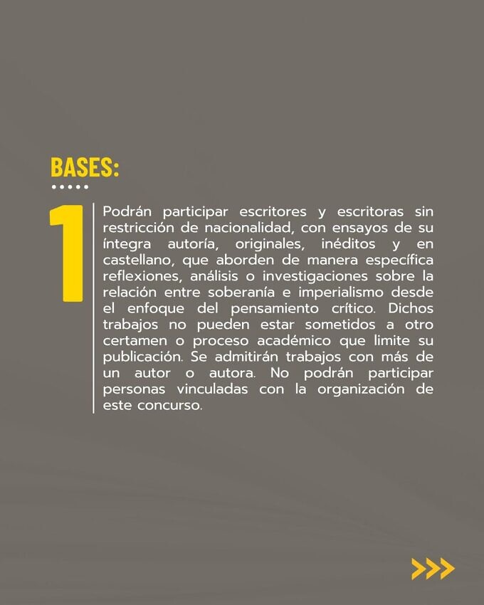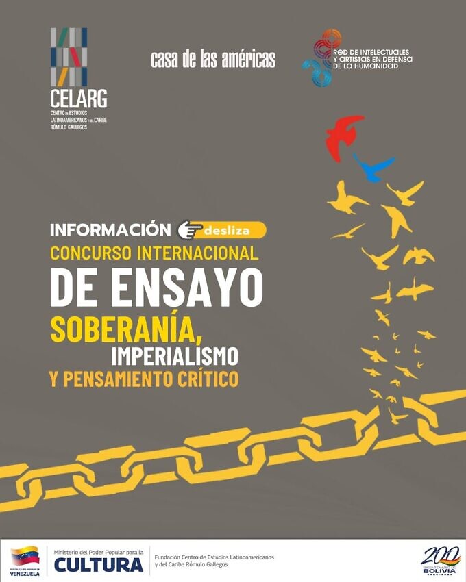 El Ministerio del Poder Popular para la Cultura de Venezuela (MPPC), a través del Centro de Estudios Latinoamericanos y del Caribe Rómulo Gallegos (Celarg), en colaboración con la prestigiosa Casa de Las Américas (Cuba) y la Red de Intelectuales, Artistas y Movimientos Sociales en Defensa de la Humanidad, mantiene abierta la convocatoria para el Concurso Internacional de Ensayo “Soberanía, imperialismo y pensamiento crítico”.