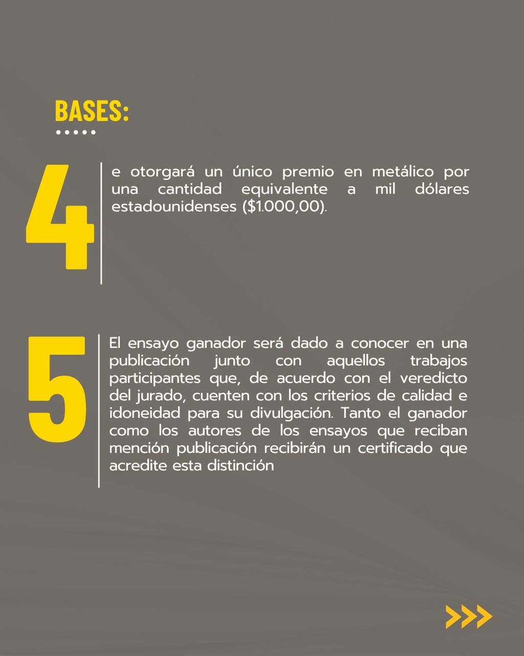 El concurso otorgará un único premio en metálico de mil dólares estadounidenses ($1.000,00). Además, el ensayo ganador y otros trabajos destacados serán publicados, y sus autores recibirán un certificado.