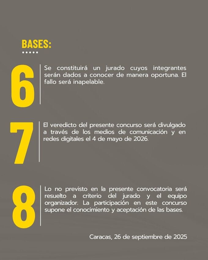 El jurado será anunciado oportunamente y su fallo se dará a conocer el 4 de mayo de 2026, a través de los medios de comunicación y redes digitales de las instituciones convocantes. La participación implica la aceptación total de las bases del concurso.