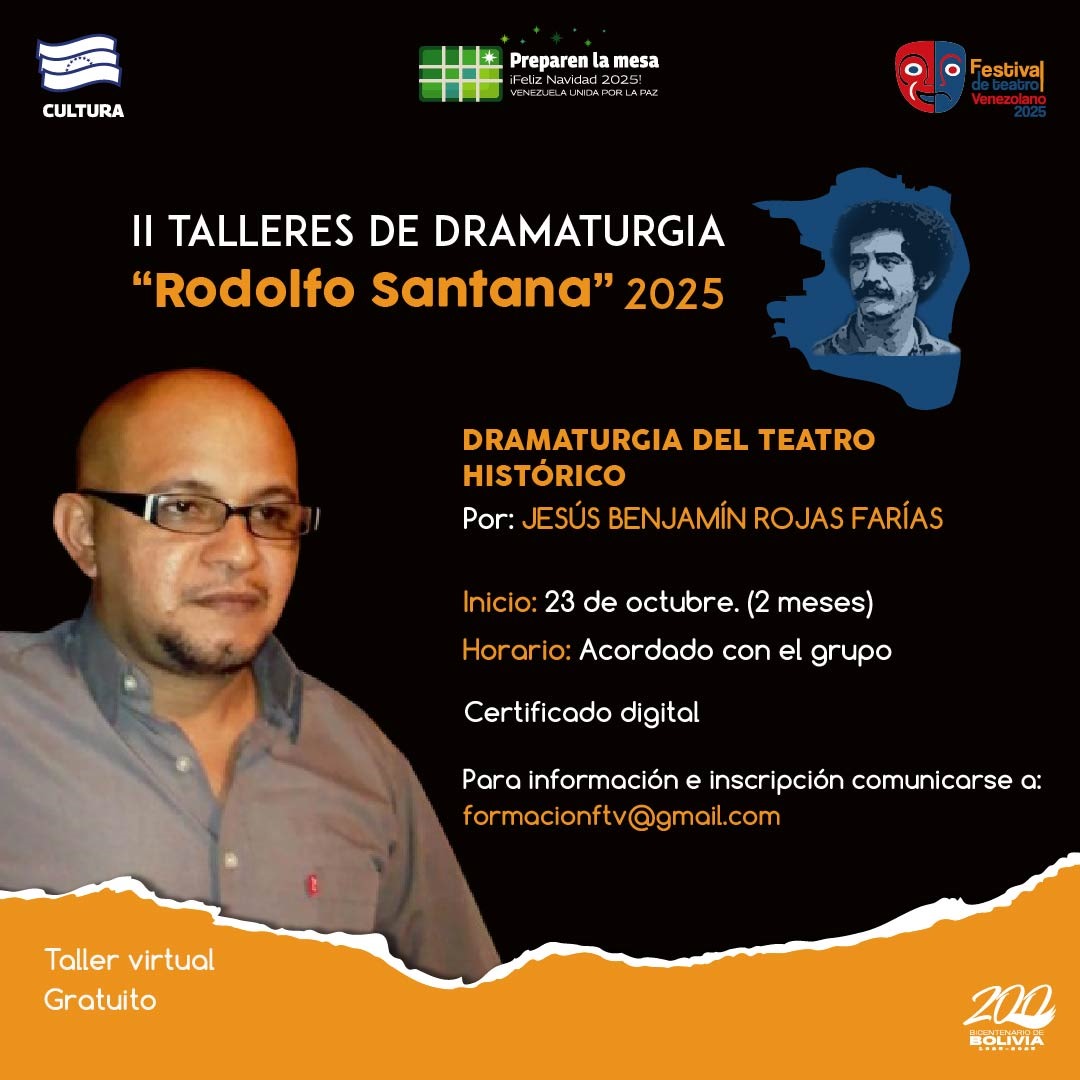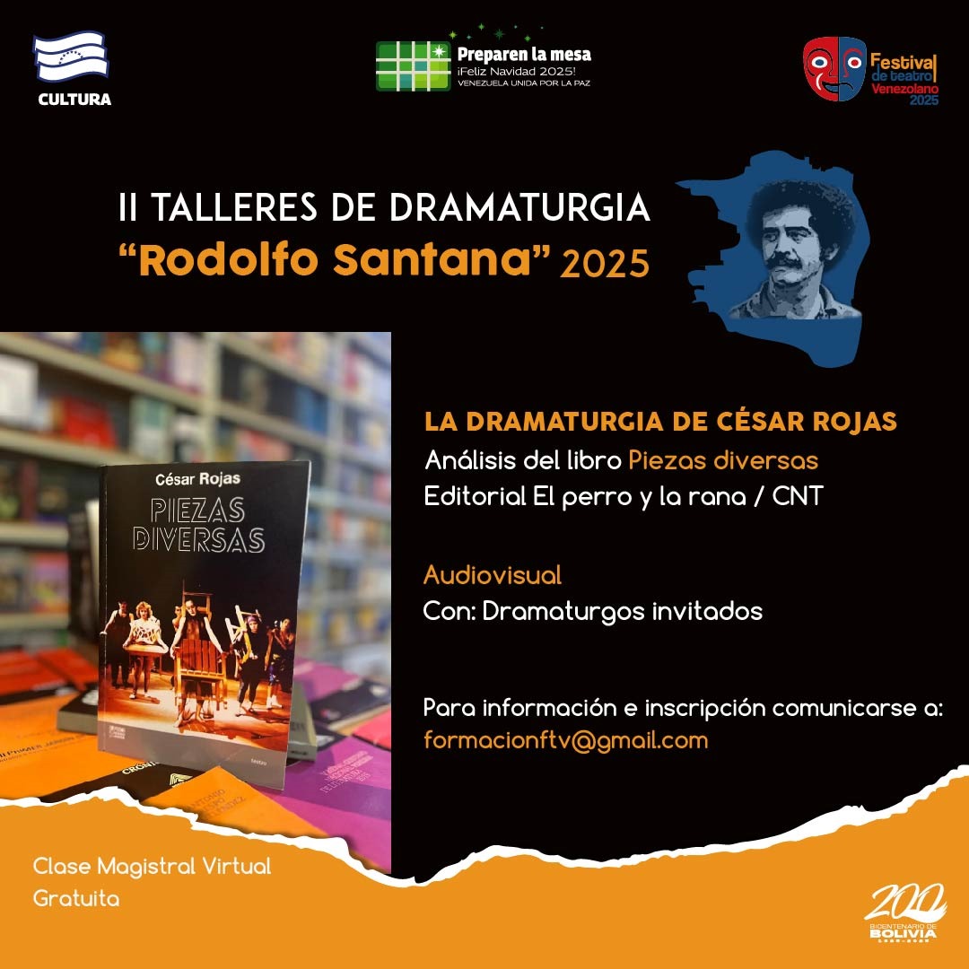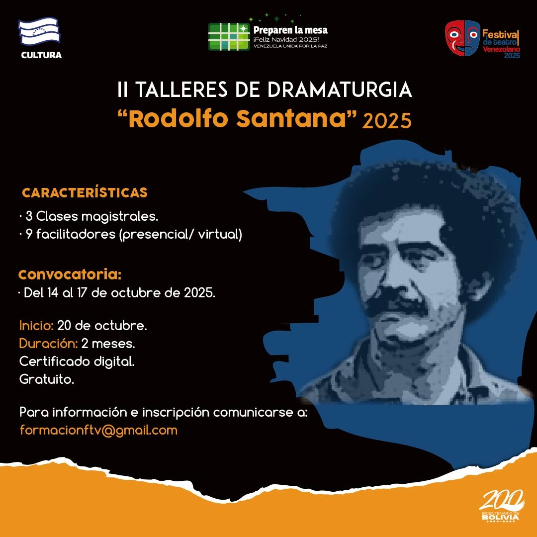 En el marco del Festival de Teatro Venezolano, la Compañía Nacional de Teatro (CNT) y el Centro Nacional del Libro (Cenal) anuncian la convocatoria a la segunda edición de los Talleres de Dramaturgia “Rodolfo Santana” 2025. Esta iniciativa de formación gratuita y de alta calidad trae consigo tres clases magistrales y nueve talleres impartidos por reconocidos maestros de la escena nacional, con el objetivo de impulsar la nueva generación de escritores teatrales.
