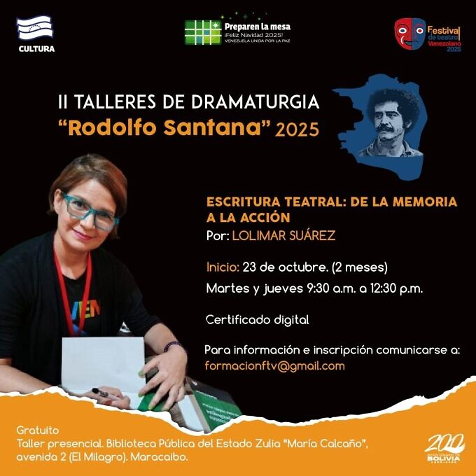 - Desde Maracaibo, Lolimar Suárez comenzará con “Escritura teatral: De la memoria a la acción” en la Biblioteca Pública del Estado Zulia “María Calcaño”. Las clases serán los martes y jueves, de 9:00 a.m. a 12:00 del mediodía.