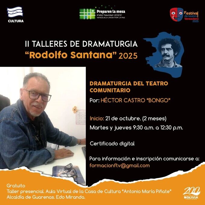La jornada formativa presencial iniciará el 21 de octubre con el taller Dramaturgia del Teatro Comunitario, a cargo de Héctor Castro. Se dictará en el Aula Virtual de la Casa de Cultura “Antonio María Piñate” de la Alcaldía de Guarenas, en el estado Miranda, con encuentros programados para los martes y jueves de 9:30 a.m. a 12:30 p.m.
