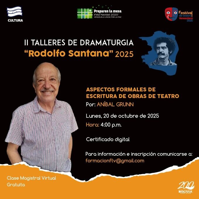 - Lunes, 20 de octubre (4:00 p.m. – Virtual). Aspectos formales de la escritura de obras teatrales, dictada por Aníbal Grunn.