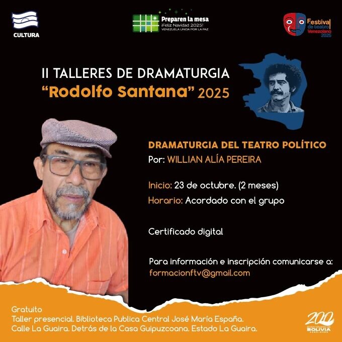 - Willian Alí Pereira estará a cargo de “Dramaturgia del Teatro Político” en la Biblioteca Pública Central José María España del estado La Guaira, también con el horario acordado por el grupo.
