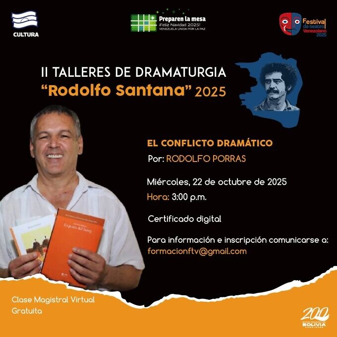- Rodolfo Porras dictará “El Conflicto Dramático” en el Museo de Arquitectura de Caracas, con clases los miércoles y jueves, de 9:30 a.m. a 12:30 p.m.