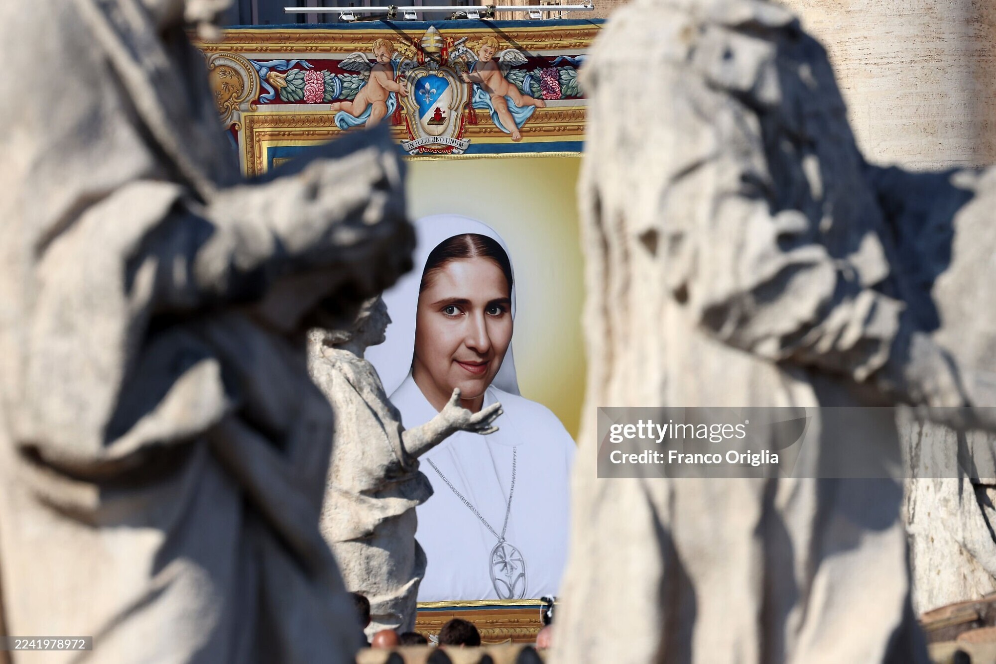 La Madre Carmen Rendiles, en un tapete que colgó en los balcones de la Basílica San Pedro este 19 de octubre. Foto: Franco Origlia/Getty Images
