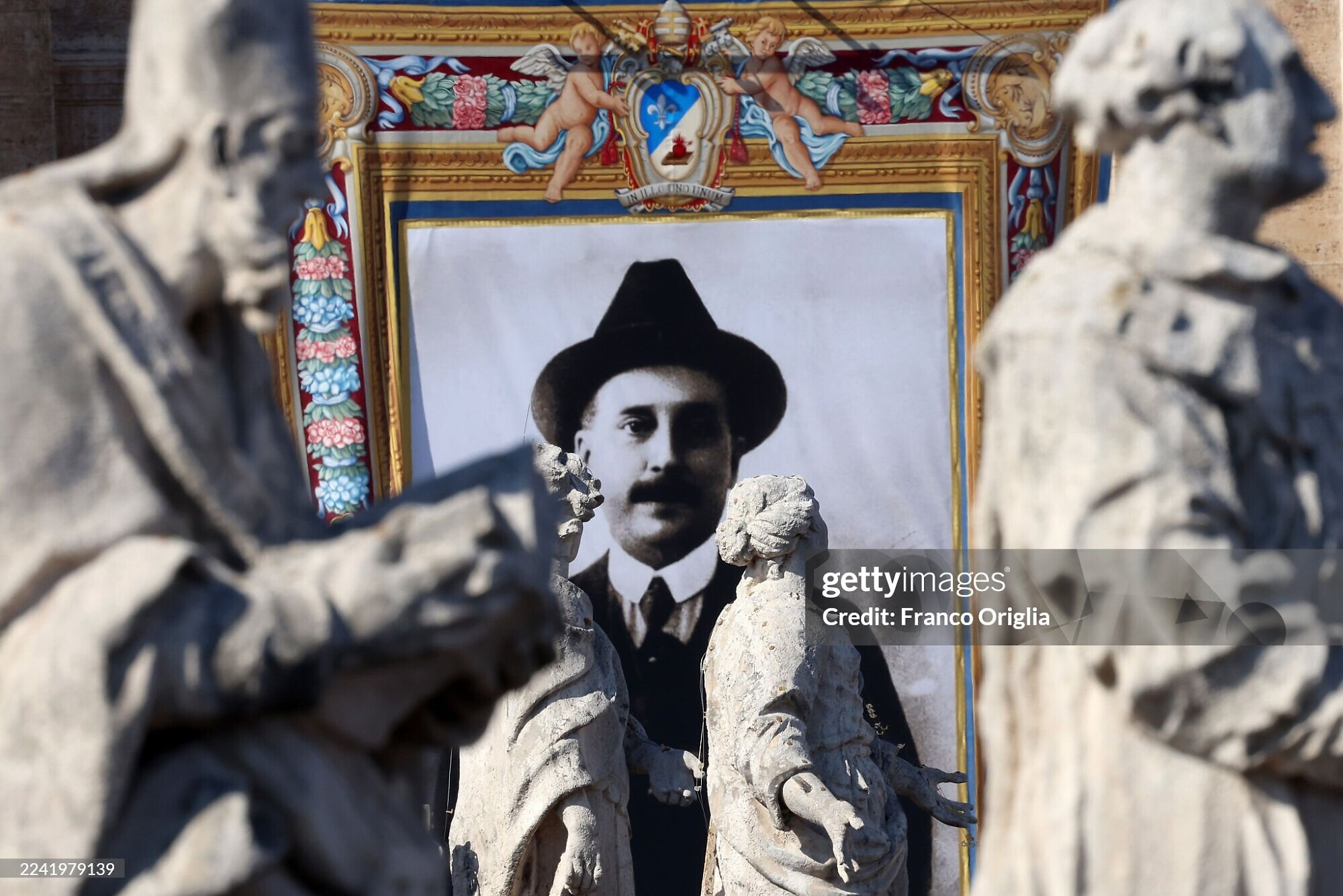 Tapete muestra a José Gregorio Hernández Cisneros, uno de los siete nuevos santos, que cuelga de un balcón de la Basílica de San Pedro durante la ceremonia de canonización liderada por el Papa León XIV este 19 de octubre. También fueron canonizados Ignatius Choukrallah Maloyan, Peter To Rot, Vincenza Maria Poloni, Maria del Monte Carmelo Rendiles Martínez, Maria Troncatti y Bartolo Longo. (Photo by Franco Origlia/Getty Images)