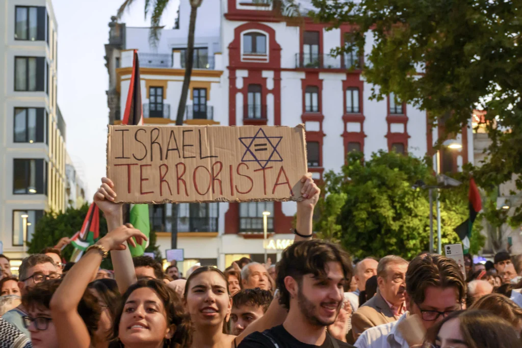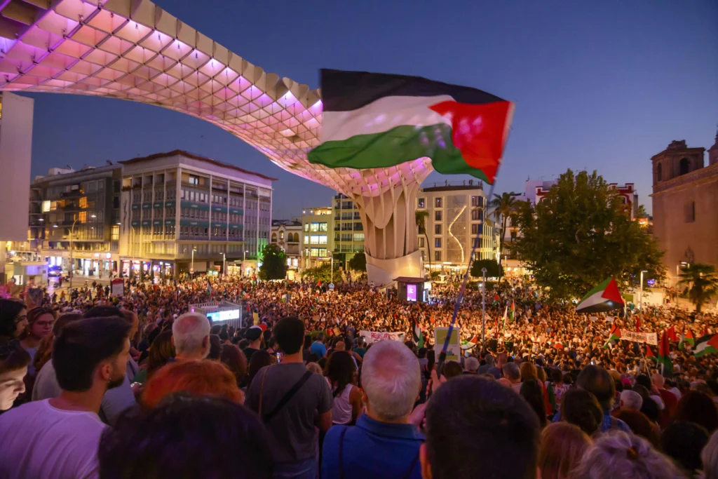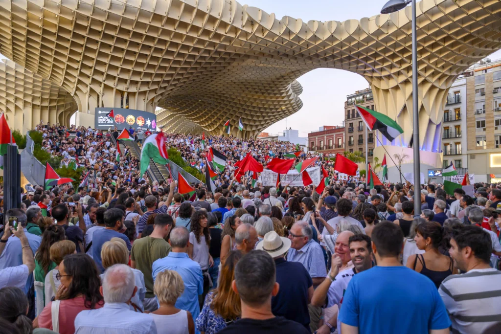 En la Plaza de la Encarnación, en Sevilla, los manifestantes denunciaron el genocidio, y acompañaron las protestas que, desde la noche del miércoles, se generaron en varias ciudades del país. Exigieron el regreso con vida de los activistas.