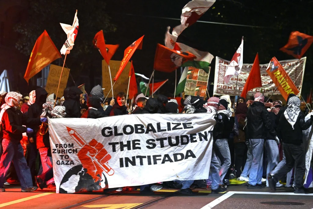 Protestas en Zürich, Suiza, exigen la liberación de los activistas, quienes fueron secuestrados por Israel después de atravesar el Mediterráneo desde puertos de España, Túnez e Italia para llevar ayuda humanitaria a Gaza. Foto: EFE