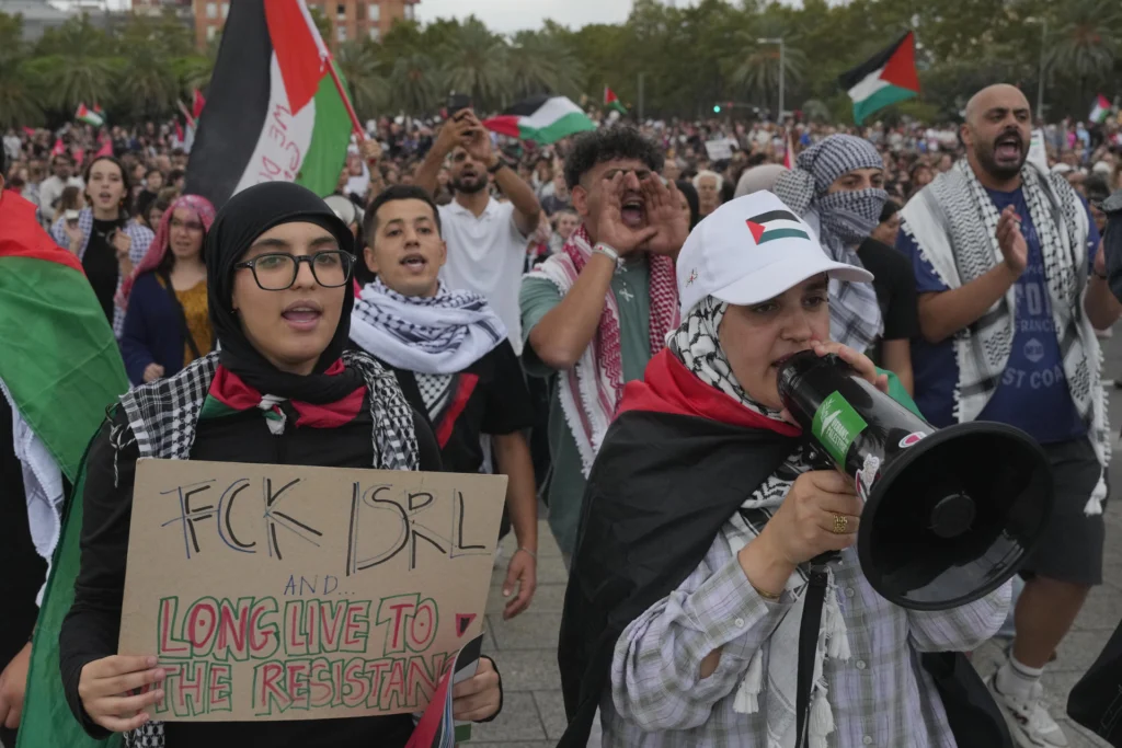 También en la plaza de las Drassanes de Barcelona, se escucharon cánticos contra el genocidio de Israel, una manifestación convocada tras el asalto a la flotilla humanitaria. Foto: EFE