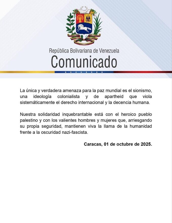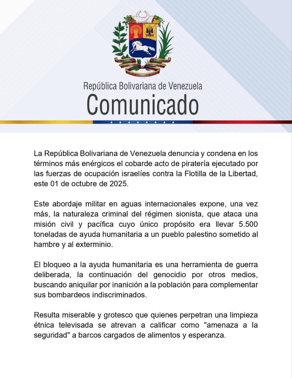 La República Bolivariana de Venezuela denuncia y condena en los términos más enérgicos “el cobarde acto de piratería” ejecutado por las fuerzas de ocupación israelíes contra la Flotilla internacional Global Sumud.