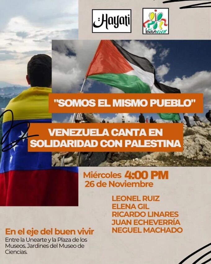 Canto en solidaridad con Palestina este miércoles en el Eje del Vivir Bien 🗓 25 noviembre, 2025 • 0 Comentarios Este miércoles a las 3:00 pm en Hayati, Eje del Buen Vivir. Jardines del Museo de Ciencias, Bellas Artes. ¡No te lo pierdas! El miércoles 26 de noviembre de 2025 Agenda Cultural