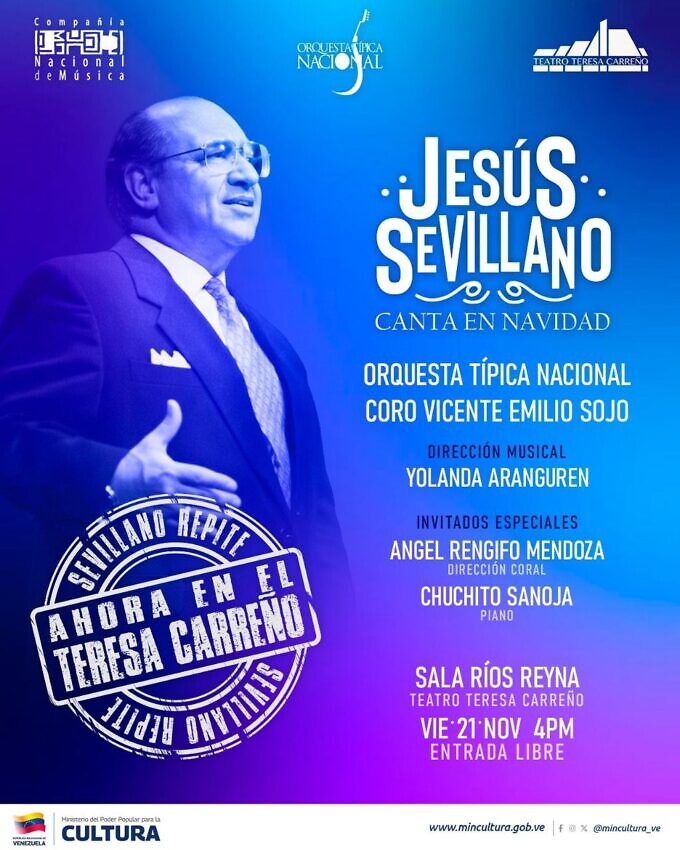 El ministro del Poder Popular para la Cultura, Ernesto Villegas Poljak, difundió a través de sus redes sociales la invitación al concierto “Jesús Sevillano canta en Navidad”, un encuentro musical que se realizará con entrada completamente gratuita este viernes 21 de noviembre a las 4:00 p. m., en la Sala Ríos Reyna del Teatro Teresa Carreño.