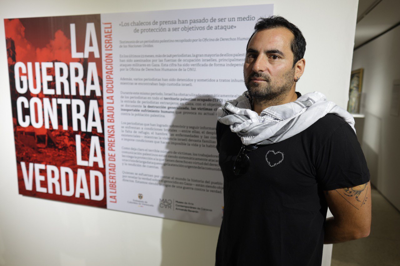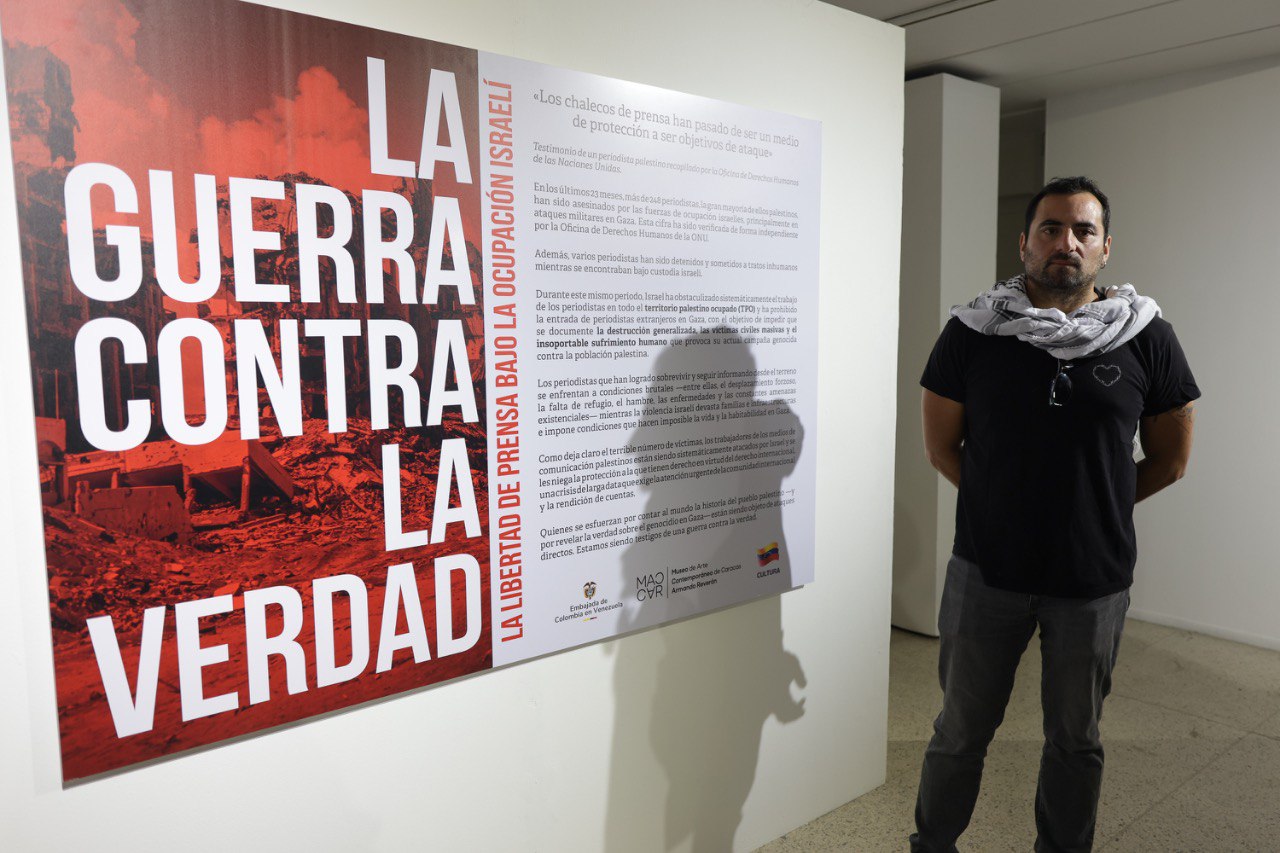 La Embajada de Colombia en Venezuela inauguró este 6 de noviembre la impactante exposición fotográfica “La Guerra contra la Verdad. La libertad de prensa bajo la ocupación israelí” en el Museo de Arte Contemporáneo de Caracas Armando Reverón (Maccar). La muestra es un tributo y un testimonio desgarrador que fusiona dos voces esenciales en el registro del conflicto: la de la joven fotoperiodista palestina Fátima Hassouna (1999–2025), cuyo trabajo documentó la vida, la resistencia y la devastación en Gaza hasta su trágico asesinato en un bombardeo israelí, y la del reconocido periodista colombiano Mauricio Morales Duarte, quien ha cubierto la ocupación israelí en Cisjordania durante más de dos décadas.