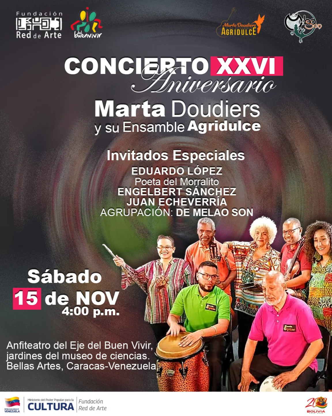 Martha Doudiers y su Ensamble Agridulce este sábado en el Eje del Buen Vivir 🗓 13 noviembre, 2025 • 0 Comentarios Con Eduardo López “El Poeta del Morralito”, Engelbert Sánchez, Juan Echeverría y De Melao Son. Este sábado 15 de noviembre a las 4 de la tarde. El sábado 15 de noviembre de 2025 Agenda Cultural