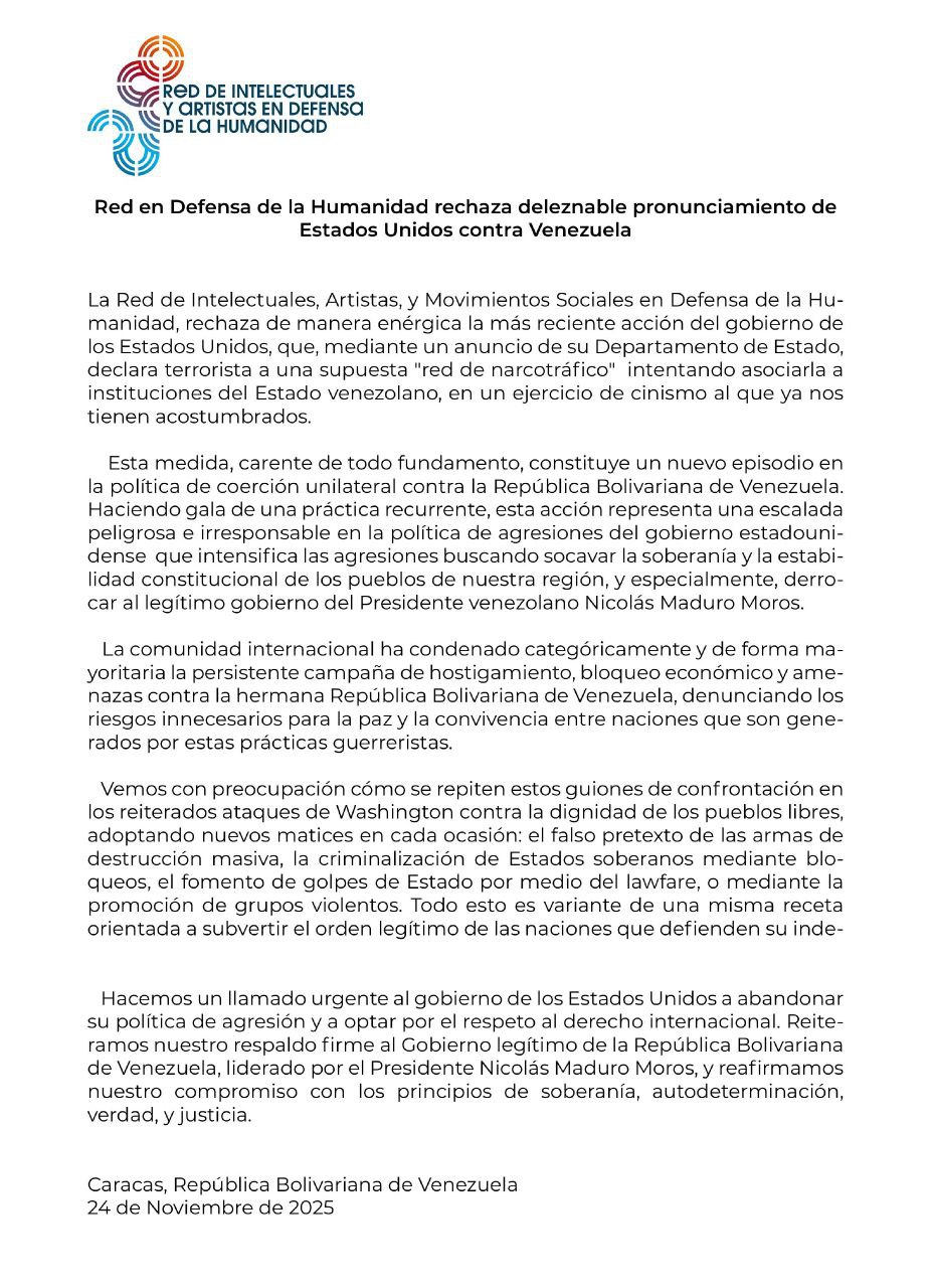 La Red de Intelectuales, Artistas y Movimientos Sociales en Defensa de la Humanidad, a través de un comunicado, rechaza de manera enérgica la más reciente acción del gobierno de Estados Unidos a través de su Departamento de Estado, declarando terrorista a la supuesta red de narcotráfico conocida como “el Cartel de los Soles”, intentando asociarla a instituciones del Estado venezolano, “en un ejercicio de cinismo al que ya nos tienen acostumbrados”.