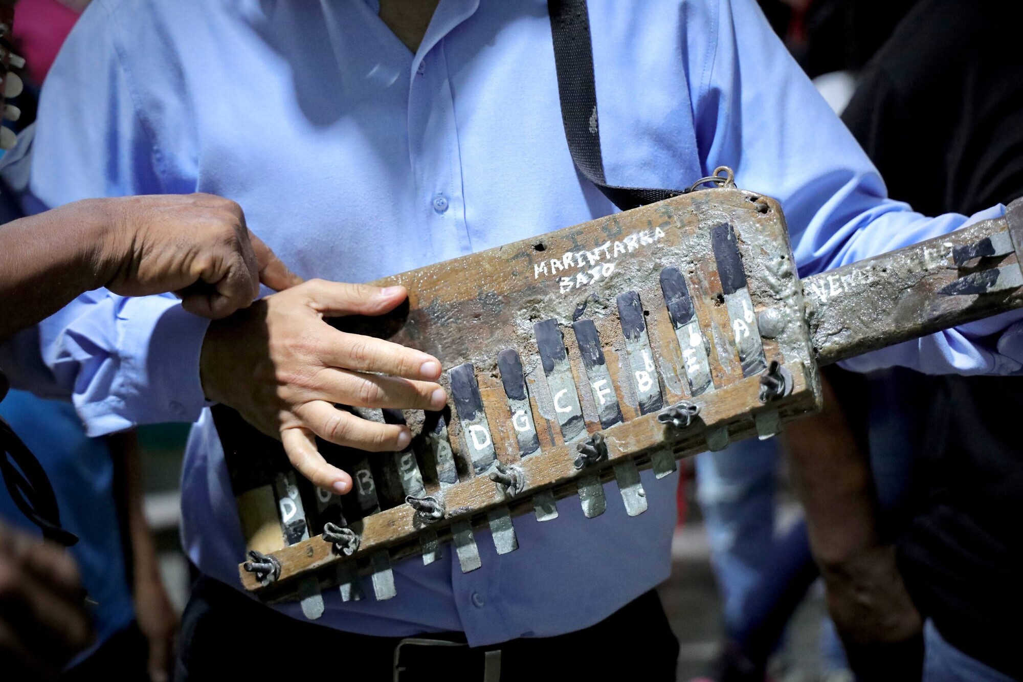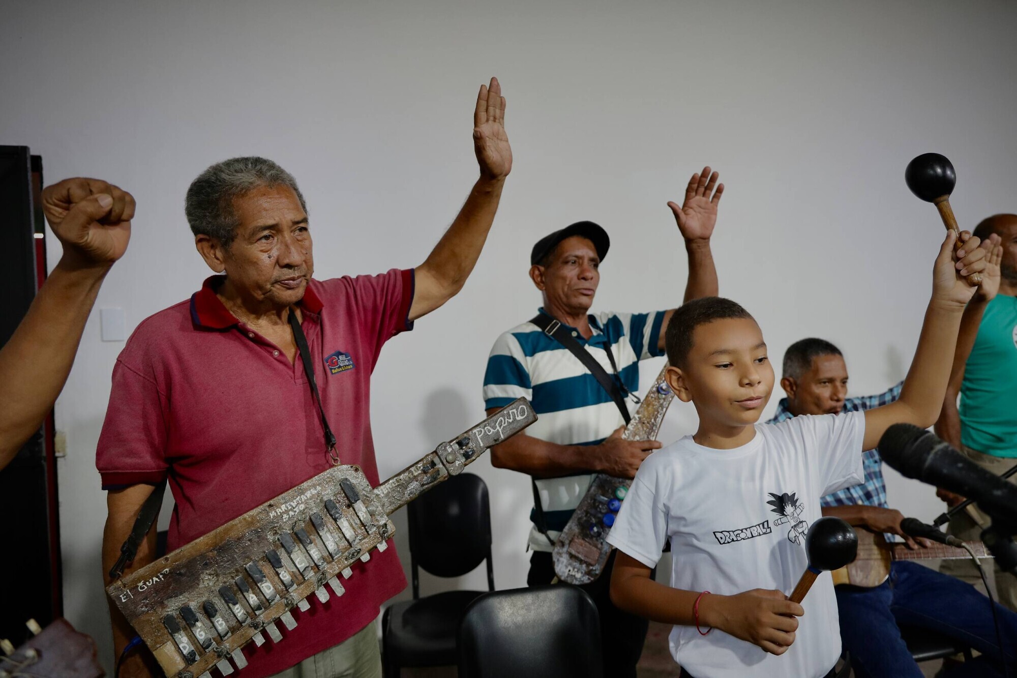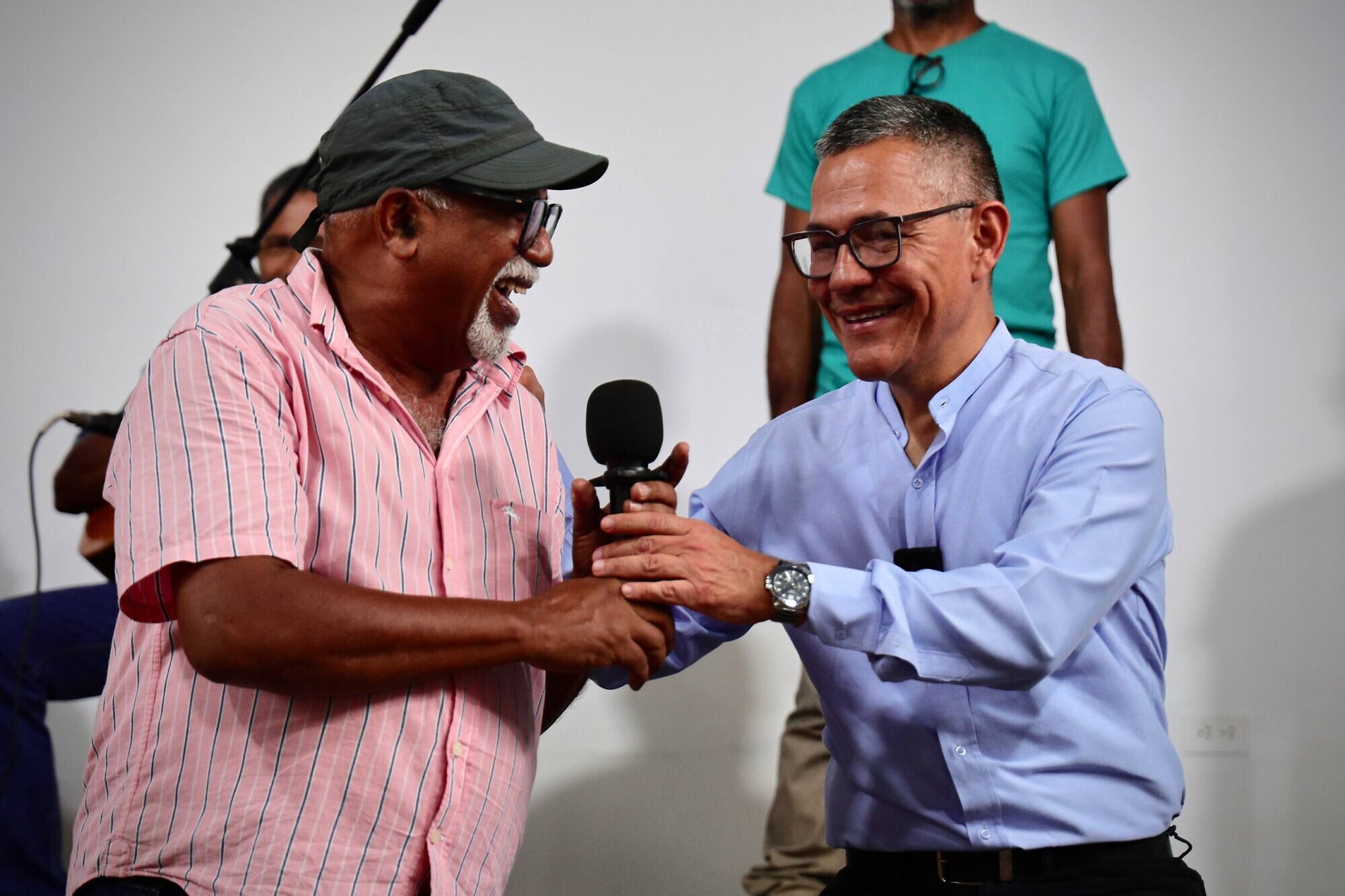 El ministro Villegas con Víctor “Papiro” Armas, destacado cultor, músico e investigador, especialista en joropo barloventeño, mostrando su conocida marímbola.