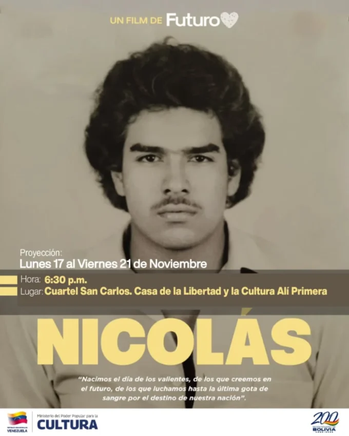 Desde este lunes 17 y hasta el viernes 21 de noviembre se estará proyectando en el Cuartel San Carlos – Casa de la Libertad y la Cultura Alí Primera, la serie “Nicolás” sobre la vida de Nicolás Maduro. La proyección inicia a las 6:30 p.m.