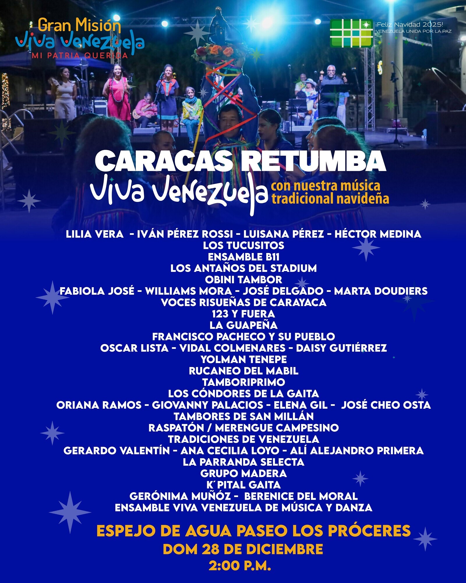 La Gran Misión “Viva Venezuela Mi Patria Querida” invita a todo el pueblo caraqueño a disfrutar de una gran jornada cultural titulada “Caracas Retumba ¡Viva Venezuela!”, un encuentro para celebrar la identidad, la música y las tradiciones venezolanas en un ambiente de alegría y paz. La actividad se realizará este domingo 28 de diciembre, a partir de las 2:00 de la tarde en el paseo Los Próceres, emblemático espacio del centro histórico de Caracas, que se llenará de cantos, tambores y expresiones artísticas provenientes de distintas regiones del país.