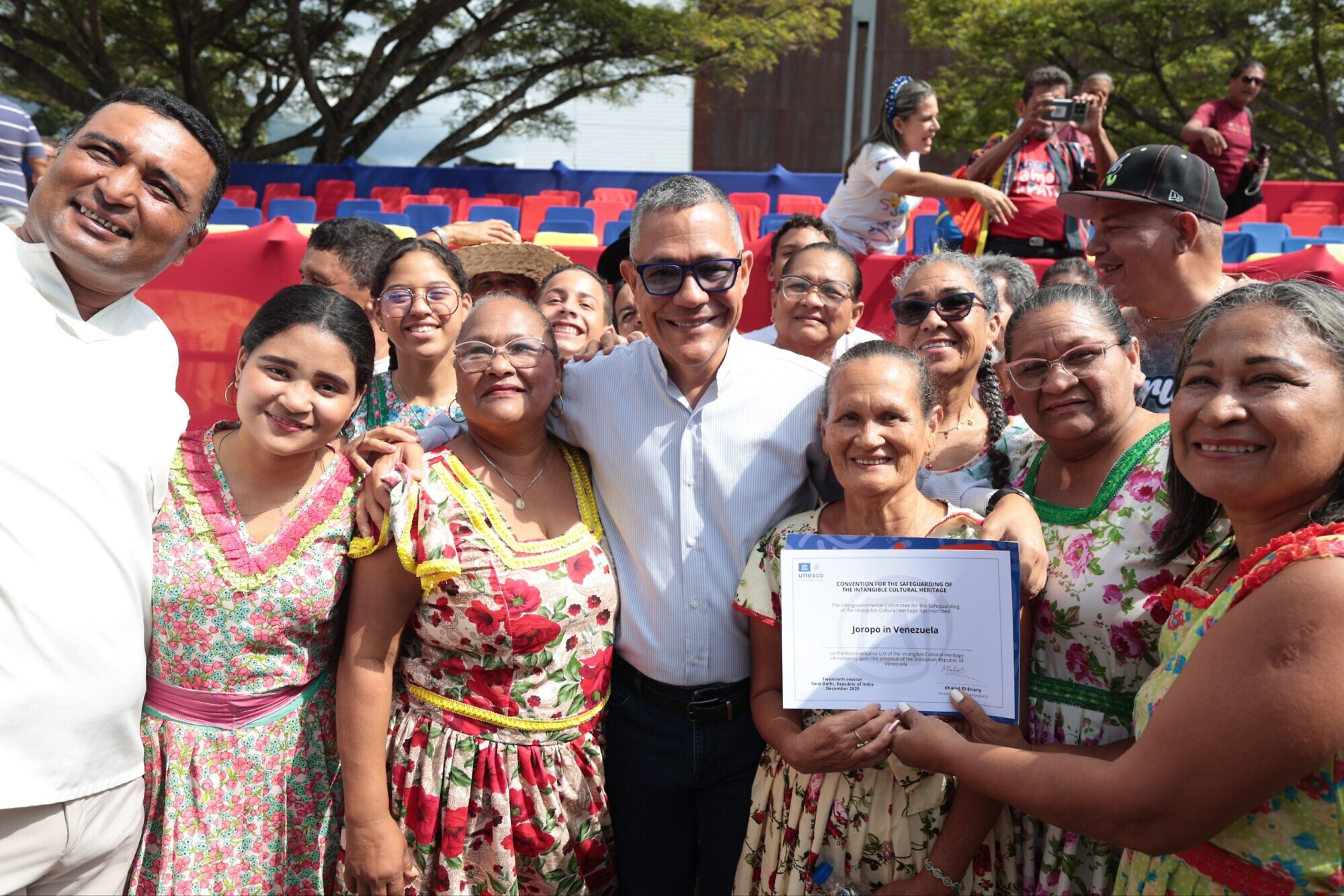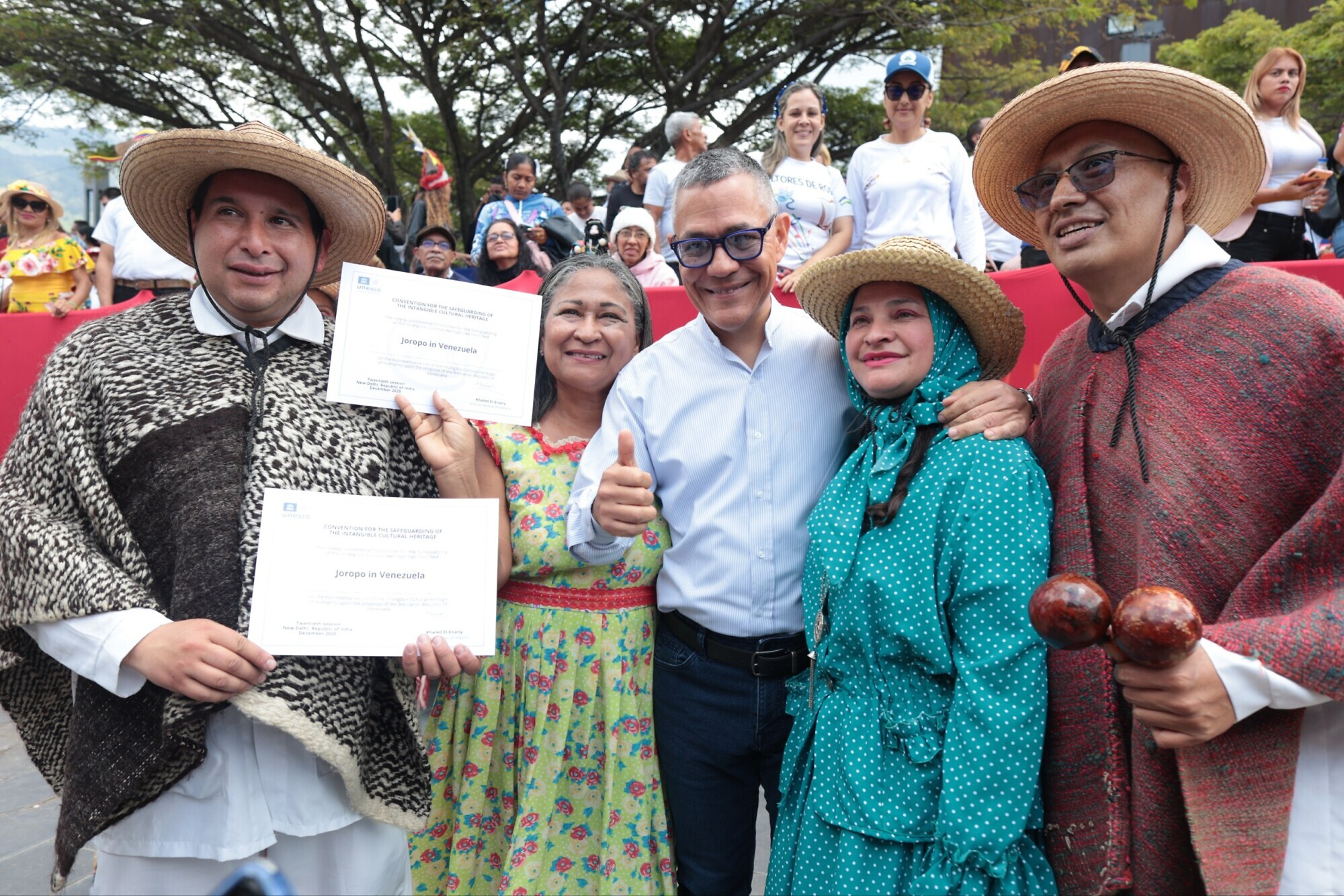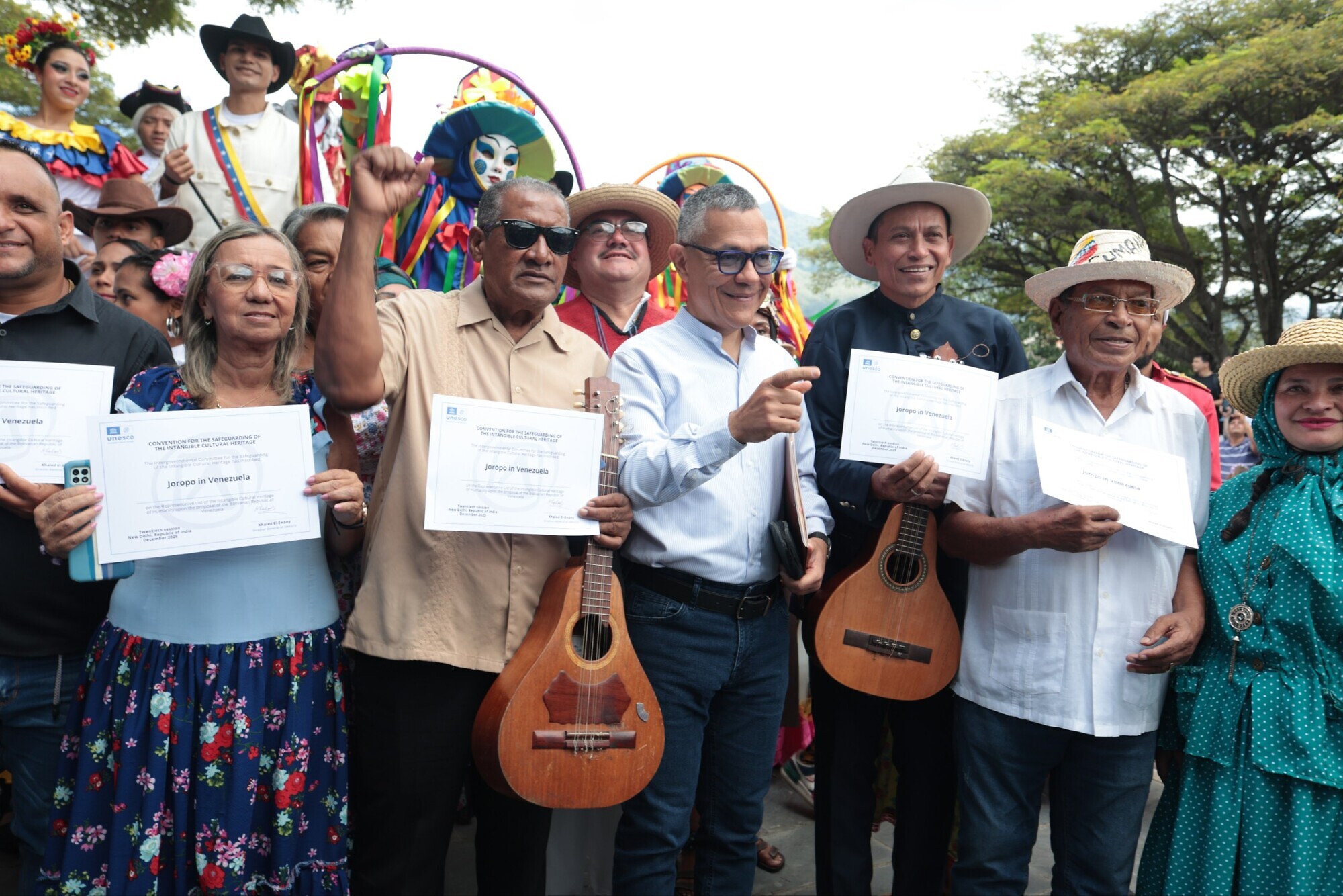 En un acto que celebró la diversidad del joropo nacional, este jueves 18 de diciembre el ministro del Poder Popular para la Cultura, Ernesto Villegas Poljak, entregó a maestros y practicantes de todo el país una réplica del Certificado de Inscripción en la Lista Representativa del Patrimonio Cultural Inmaterial de la Humanidad del Joropo en Venezuela, otorgado por la Unesco.
