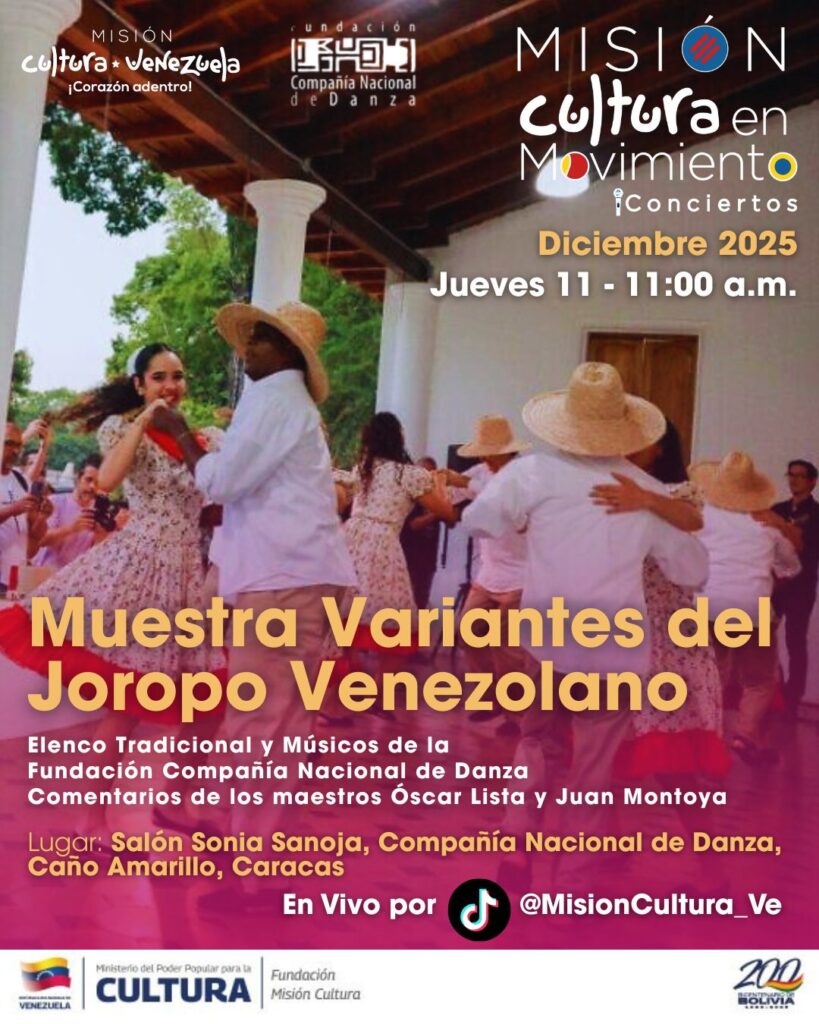- El jueves 11, a las 11:00 a.m. será el turno de Misión Cultura en Movimiento Conciertos, que presentará una muestra de variantes del joropo venezolano, a cargo del elenco tradicional y músicos de la Compañía Nacional de Danza, con comentarios de los maestros Juan Montoya y Óscar Lista. La transmisión en vivo será por TikTok: @MisionCultura_Ve, desde la sede de la Compañía Nacional de Danza.