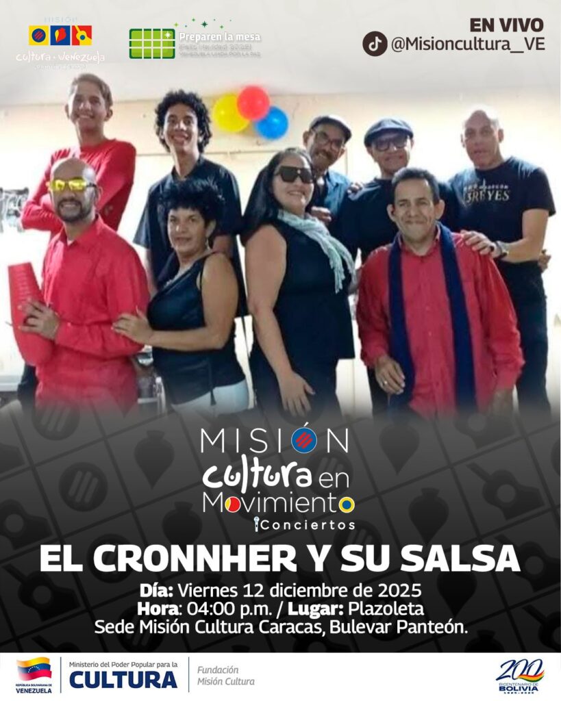 - El viernes 12, se presentará la agrupación de gaita “El Milagro” a las 2:00 p.m. y “El Chronnher y su salsa” a las 4:00 p.m. en la sede de la Misión Cultura, en Caracas. Ambos conciertos serán transmitidos en vivo por TikTok: @MisiónCultura_Ve.