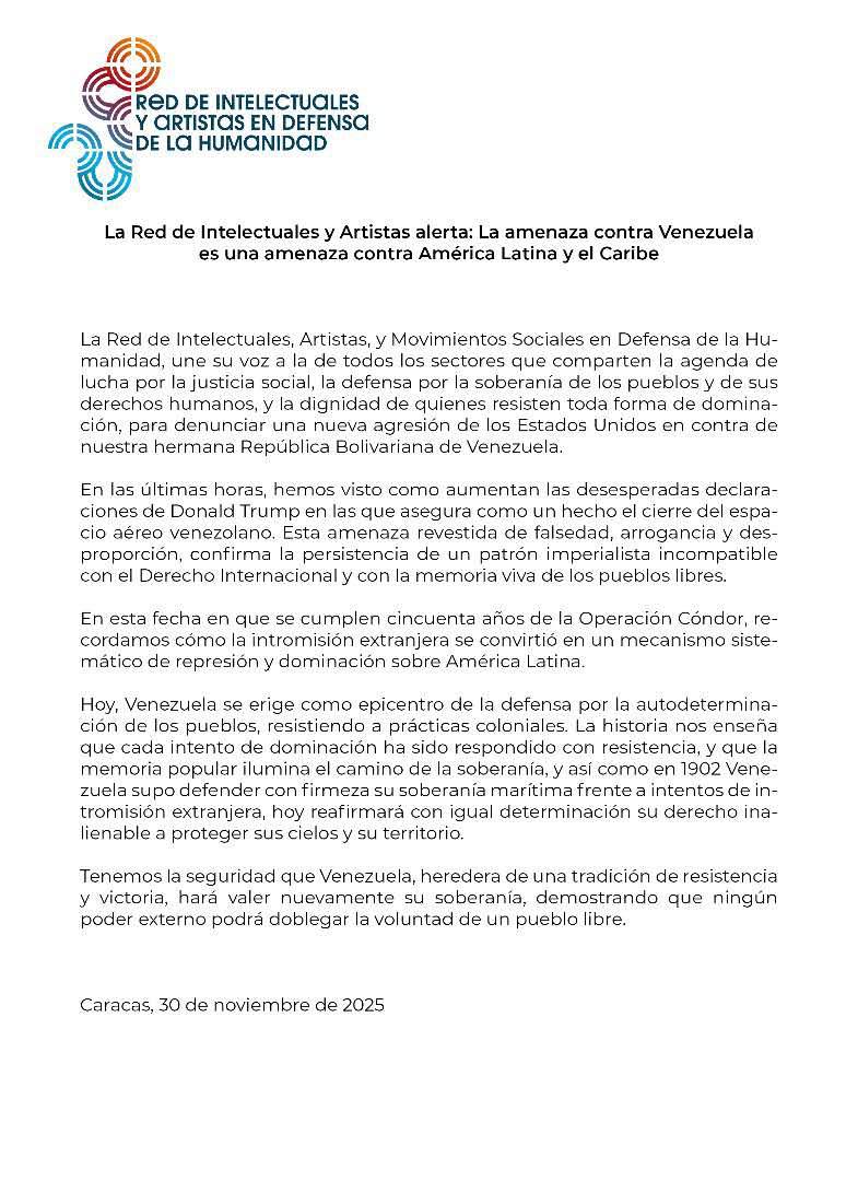 La Red de Intelectuales, Artistas, y Movimientos Sociales en Defensa de la Humanidad, une su voz a la de todos los sectores que comparten la agenda de lucha por la justicia social, la defensa por la soberanía de los pueblos y de sus derechos humanos, y la dignidad de quienes resisten toda forma de dominación, para denunciar una nueva agresión de los Estados Unidos en contra de nuestra hermana República Bolivariana de Venezuela.