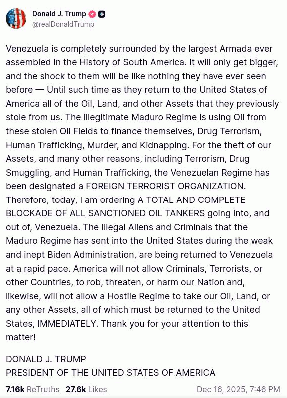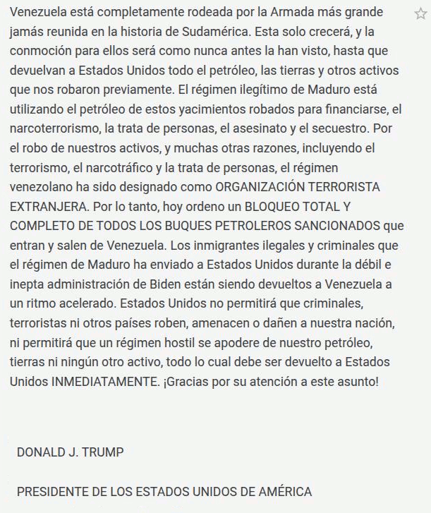El texto de Trump continuó: “Por el robo de nuestros activos, y por muchas otras razones, incluyendo el terrorismo, el narcotráfico y la trata de personas, el régimen venezolano ha sido designado como una organización terrorista extranjera. Por lo tanto, hoy ordeno un bloqueo total y completo de todos los buques petroleros sancionados que entran y salen de Venezuela“.