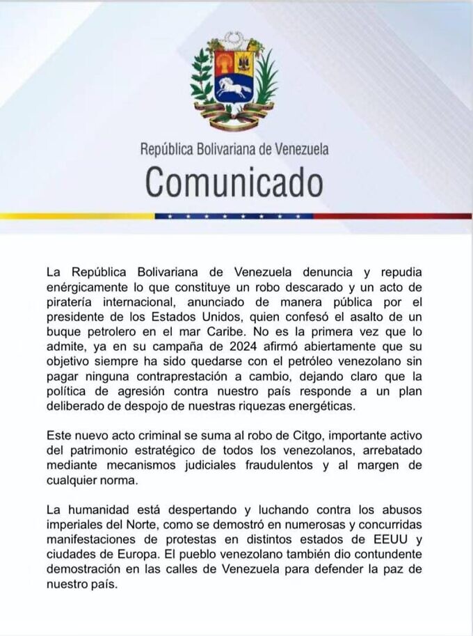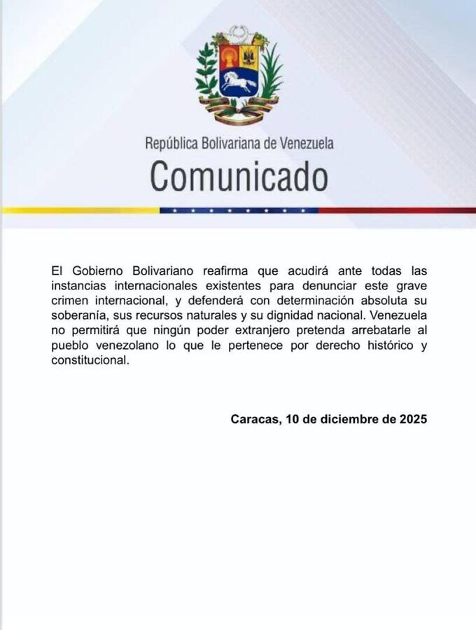 En un comunicado difundido este miércoles en la noche por el canciller Yván Gil, el gobierno venezolano repudió enérgicamente el “asalto confesado por la Casa Blanca” contra un buque petrolero en el mar Caribe. El texto oficial subraya que este hecho constituye una violación flagrante del derecho internacional y anunció que Venezuela llevará la denuncia a instancias multilaterales, incluyendo la ONU y otros organismos internacionales, para exponer la agresión y exigir responsabilidades.
