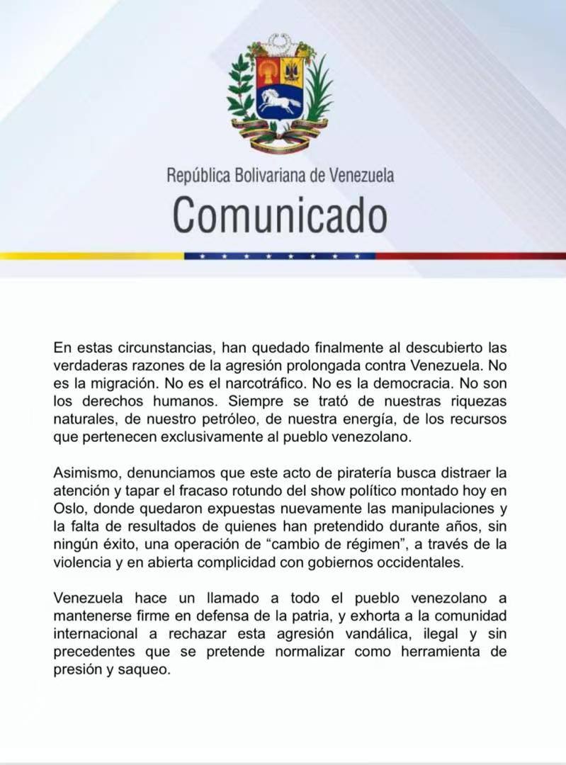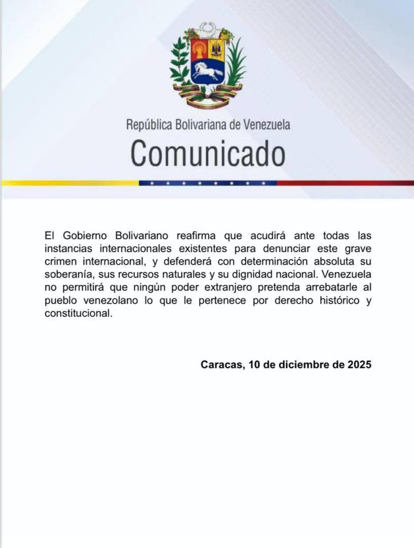 En un comunicado difundido este miércoles en la noche por el canciller Yván Gil, el gobierno venezolano repudió enérgicamente el “asalto confesado por la Casa Blanca” contra un buque petrolero en el mar Caribe. El texto oficial subraya que este hecho constituye una violación flagrante del derecho internacional y anunció que Venezuela llevará la denuncia a instancias multilaterales, incluyendo la ONU y otros organismos internacionales, para exponer la agresión y exigir responsabilidades.