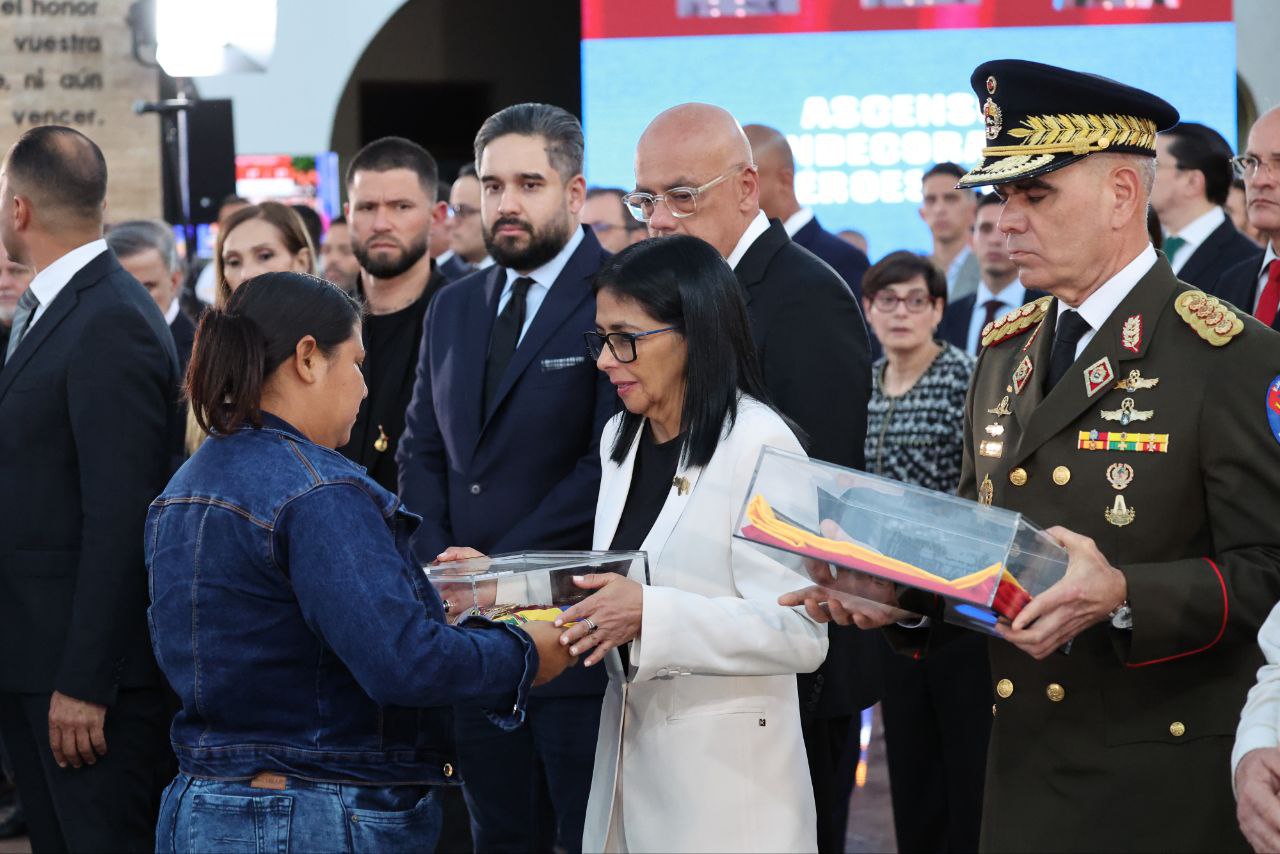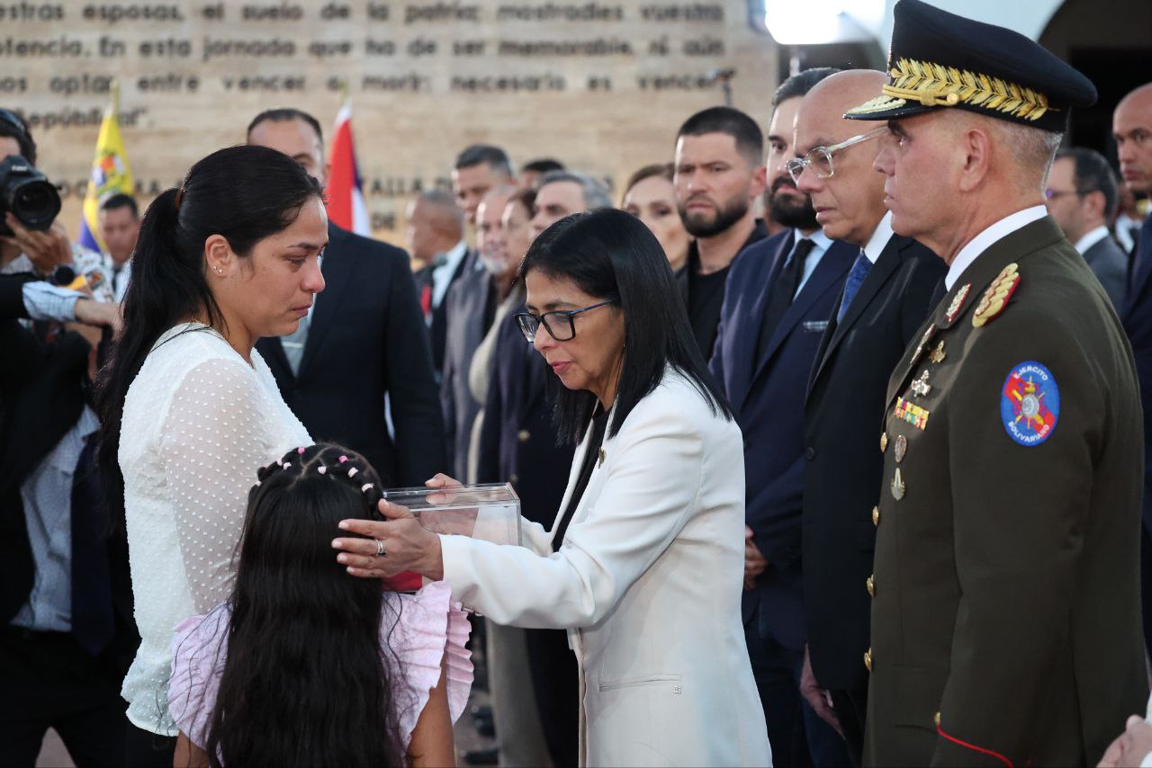 La Presidenta Encargada de Venezuela, Delcy Rodríguez, encabezó este jueves un solemne acto de ascensos y condecoraciones en el Monumento Ecléctico de la Academia Militar de la Guardia Nacional Bolivariana, en Caracas, para honrar la memoria y el sacrificio de soldados y ciudadanos que fueron asesinados el pasado 3 de enero en el bombardeo ilegal realizado por el gobierno de Estados Unidos contra el país para secuestrar al Presidente Nicolás Maduro y a la Primera Dama, Cilia Flores. También se homenajeó a los efectivos que resultaron heridos ese día.