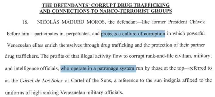 La nueva acusación, en lugar de describirlo como una organización jerárquica dedicada al narcotráfico, lo define como una “cultura de corrupción” integrada altos funcionarios civiles y militares venezolanos, “protegen y promueven el tráfico de drogas”, una definición alejada de un cártel de narcotráfico con la cual el presidente estadounidense, Donald Trump, justificó un despliegue militar sin antecedentes en el mar Caribe y que se instaló como un bloqueo a la exportación del petróleo venezolano.