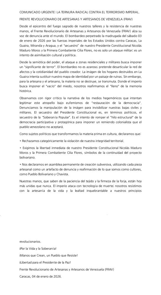 A través de dos comunicados, el Movimiento Teatral Venezolano Organizado y el Frente Revolucionario de Artesanas y Artesanos de Venezuela (FRAV), fijaron posición conjunta frente a la agresión imperial contra la República Bolivariana de Venezuela, reafirmando su compromiso con la defensa de la soberanía, independencia y libertad del pueblo venezolano.