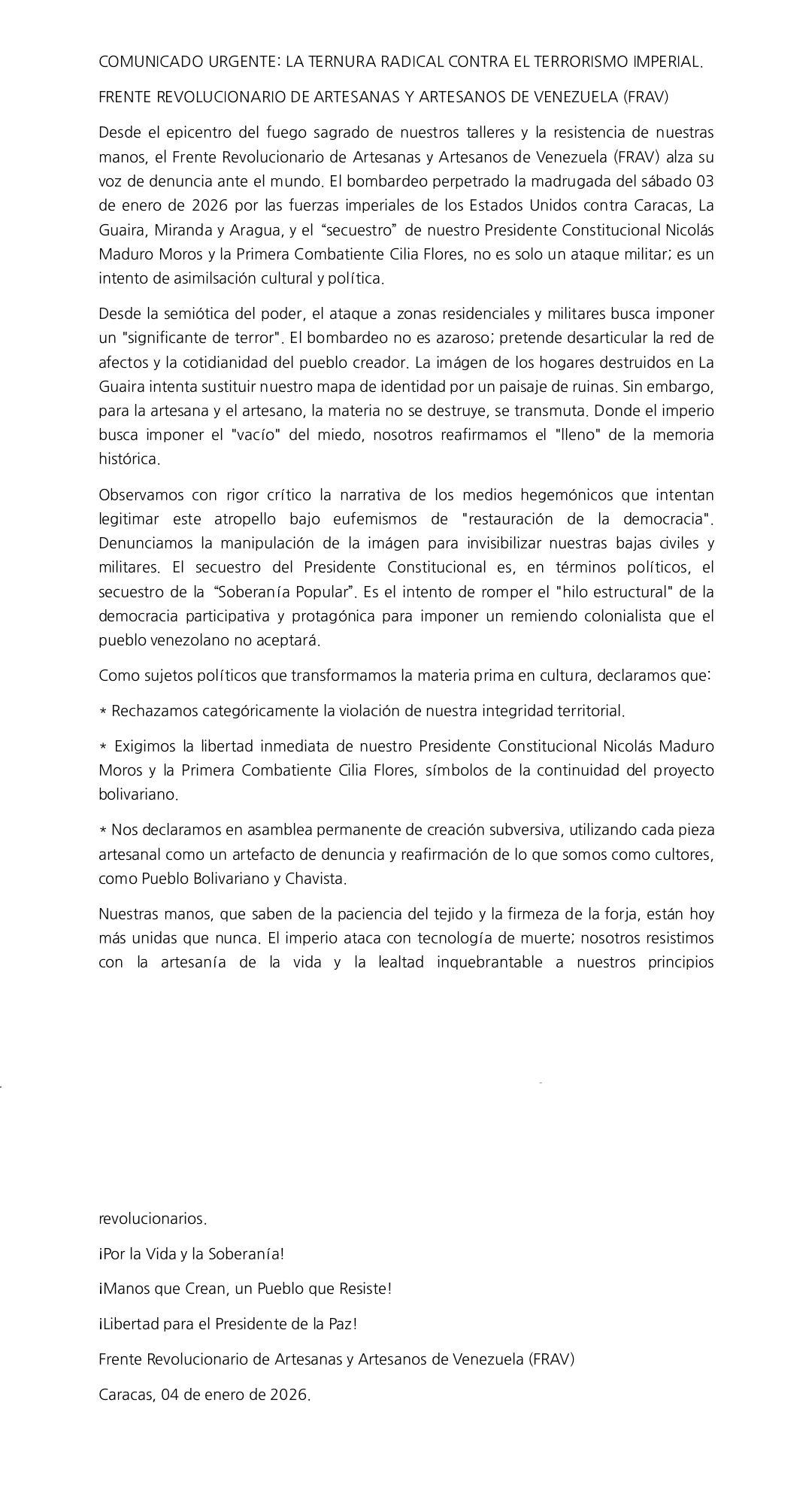 A través de dos comunicados, el Movimiento Teatral Venezolano Organizado y el Frente Revolucionario de Artesanas y Artesanos de Venezuela (FRAV), fijaron posición conjunta frente a la agresión imperial contra la República Bolivariana de Venezuela, reafirmando su compromiso con la defensa de la soberanía, independencia y libertad del pueblo venezolano.