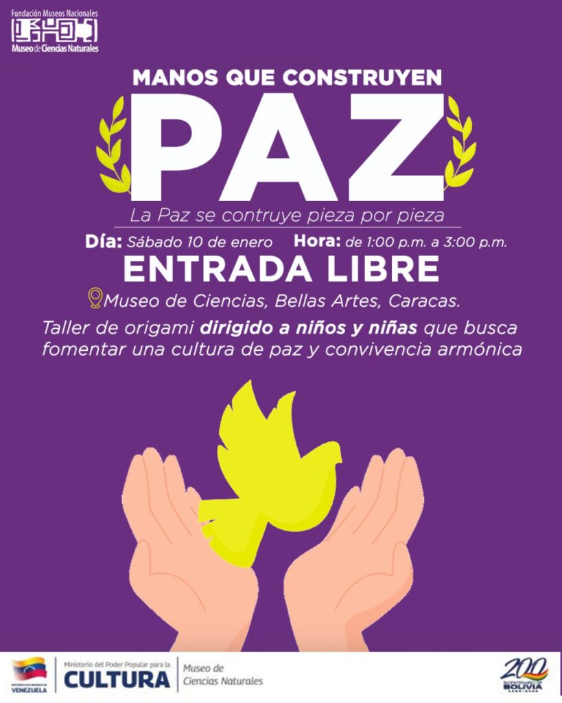 El Ministerio del Poder Popular para la Cultura (MPPC), a través de la Fundación Museos Nacionales (FMN), invita a la comunidad de niños y niñas de Venezuela a que se dirijan el venidero sábado 10 de enero de 2025 al Museo de Ciencias (MUCI), para participar en el taller creativo, “Manos que Construyen Paz”, en el que aprenderán la técnica milenaria del origami.