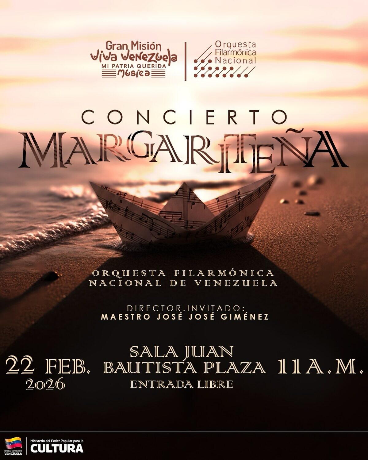 Señala la nota de prensa que la sala Juan Bautista Plaza será el escenario ideal para que nuevamente tengamos la oportunidad de disfrutar de esta hermosa composición que ejecutará la Orquesta Filarmónica Nacional de Venezuela bajo la batuta del maestro invitado José José Giménez. Están invitados a esta actividad este domingo 22 de febrero a las 11 de la mañana. Entrada Libre.