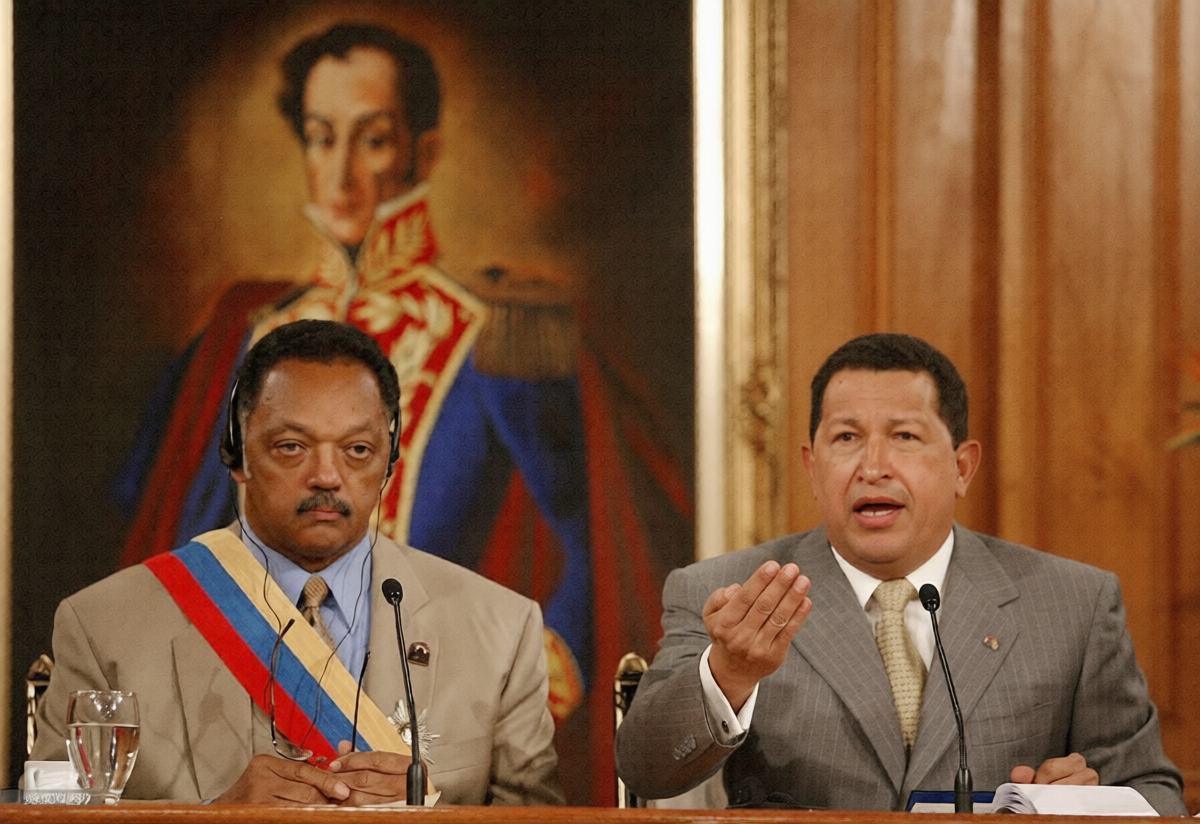 Presidente venezolano Hugo Chávez con Jesse Jackson en el Palacio de Miraflores el 29 de agosto de 2005. Foto por ANDREW ALVAREZ / AFP / Getty Images