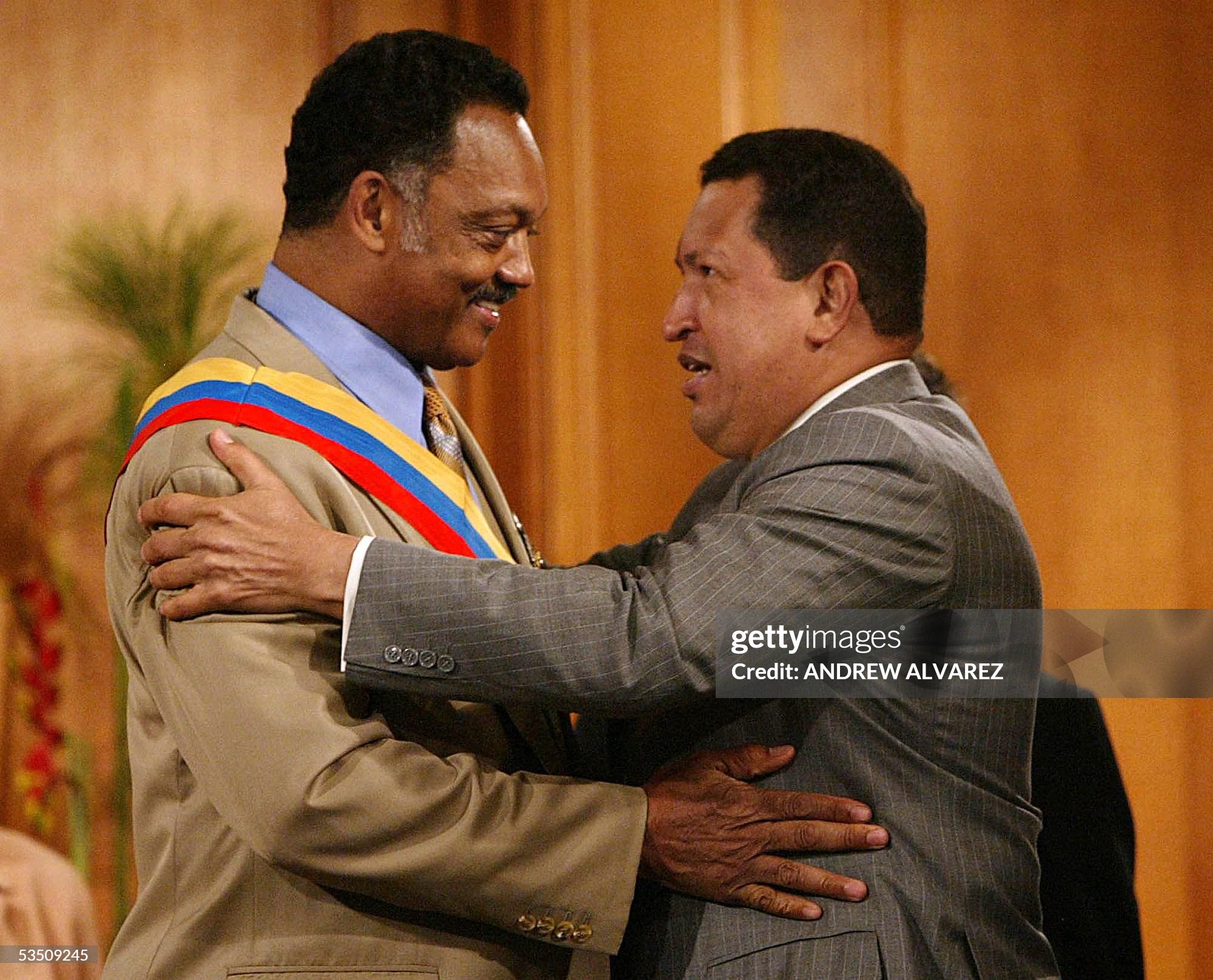 Presidente venezolano Hugo Chávez le entrega a Jesse Jackson la Orden Libertador en el Palacio de Miraflores el 29 de agosto de 2005. Foto por ANDREW ALVAREZ / AFP / Getty Images)