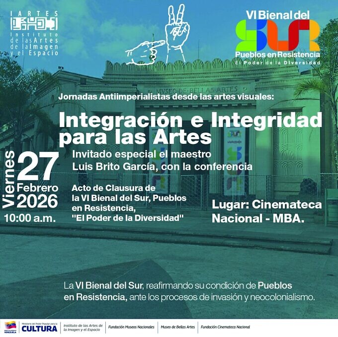 Este viernes 27 de febrero a las 10 de la mañana, no te pierdas la conferencia “Integración e integridad para las artes”, que será impartida por el maestro Luis Britto García en la Cinemateca Nacional del Museo de Bellas Artes, en Caracas. Se realizará como parte del acto de clausura de la VI Bienal del Sur “Pueblos en resistencia”. ¡Asiste!